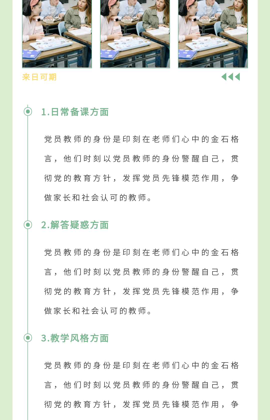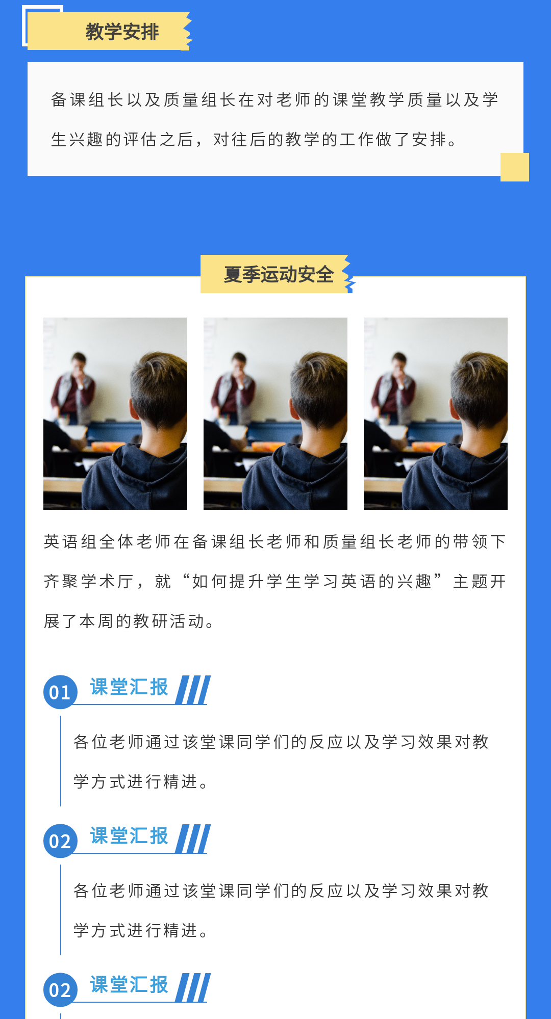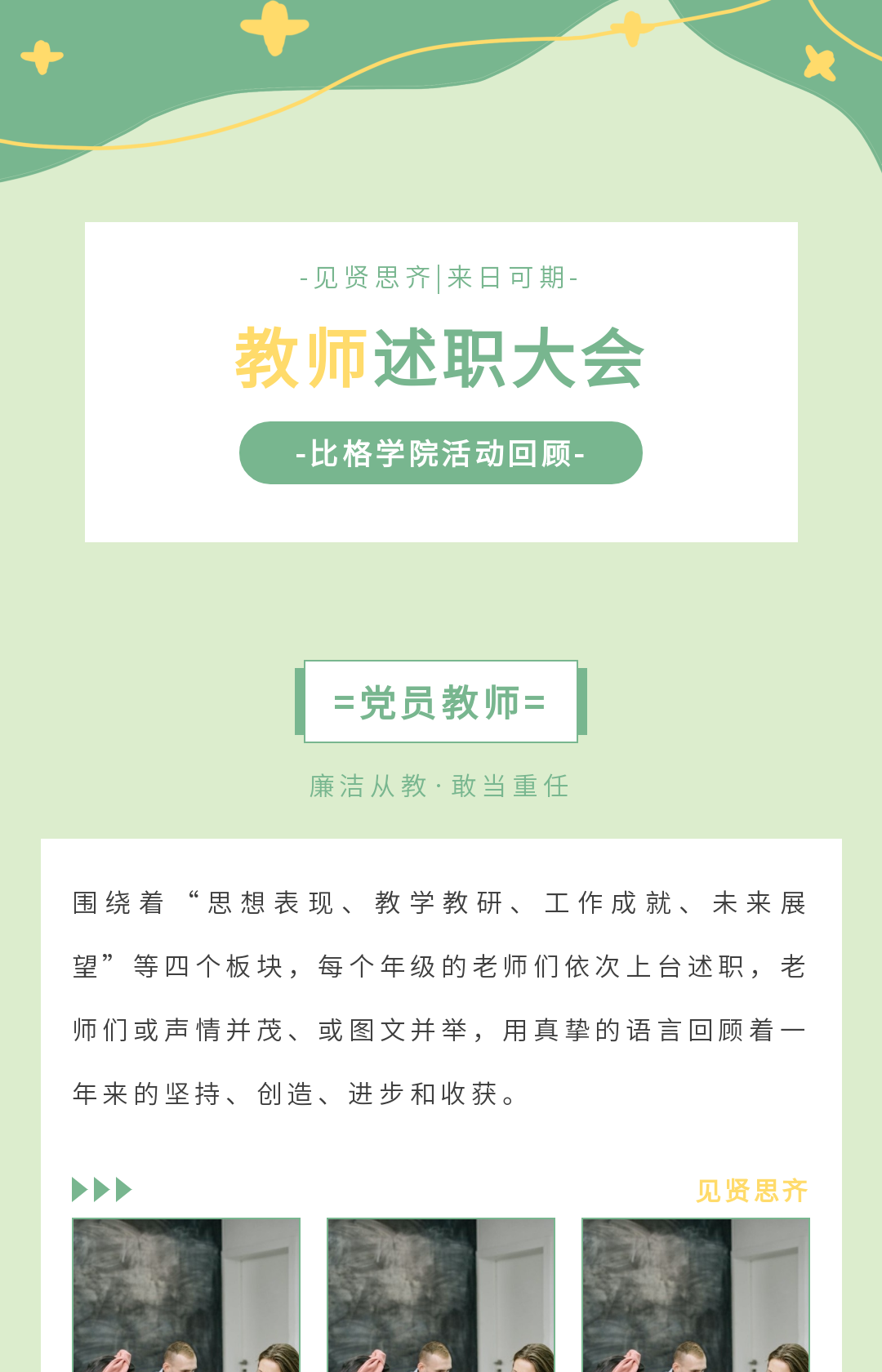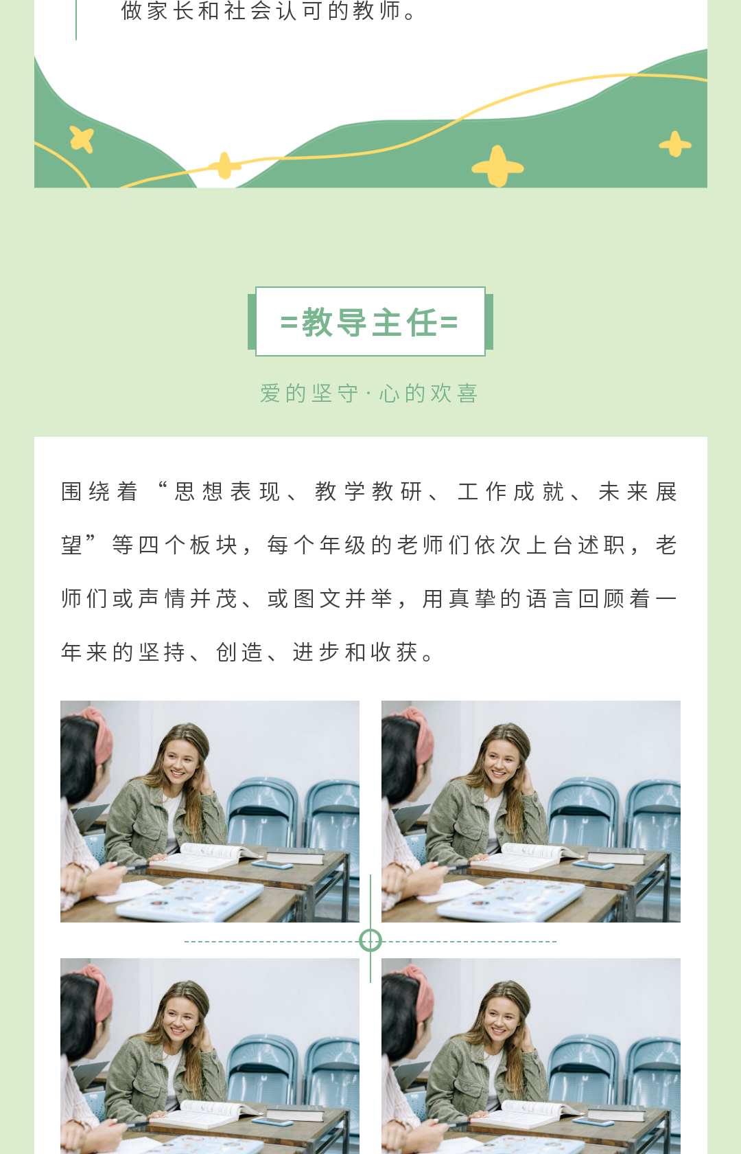 教師述職類模板/教研活動是教育主題活動模板的重要一部分,對于老師而言是展現(xiàn)教學(xué)工作、課堂效果很好的窗口,學(xué)生家長對這一塊關(guān)注也較多,因此三兒選取了4個模板來進(jìn)行推薦,這些模板的色彩上都比較偏清新、商務(wù),從這四個模板的布局來看,圖文搭配合理,整體都以簡約為主,重點(diǎn)突出。