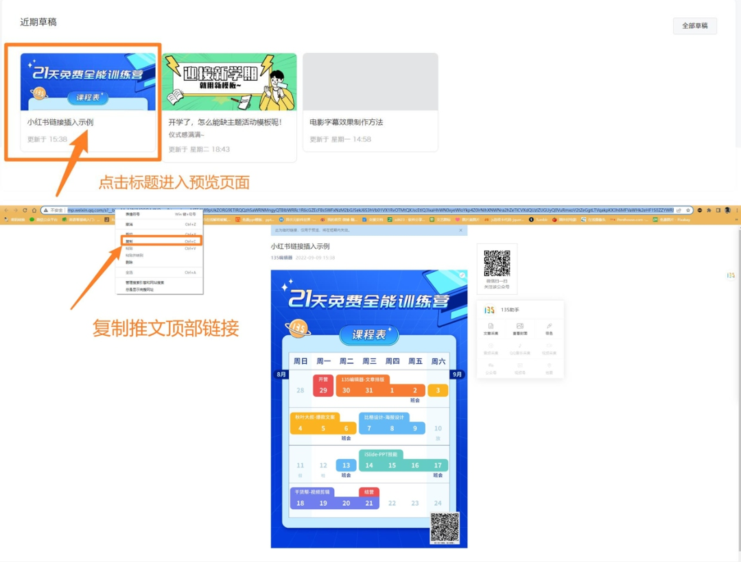 #保存文章后,在【草稿箱】中找到該文,點(diǎn)擊標(biāo)題進(jìn)入預(yù)覽頁面,復(fù)制文章頂部臨時(shí)鏈接;