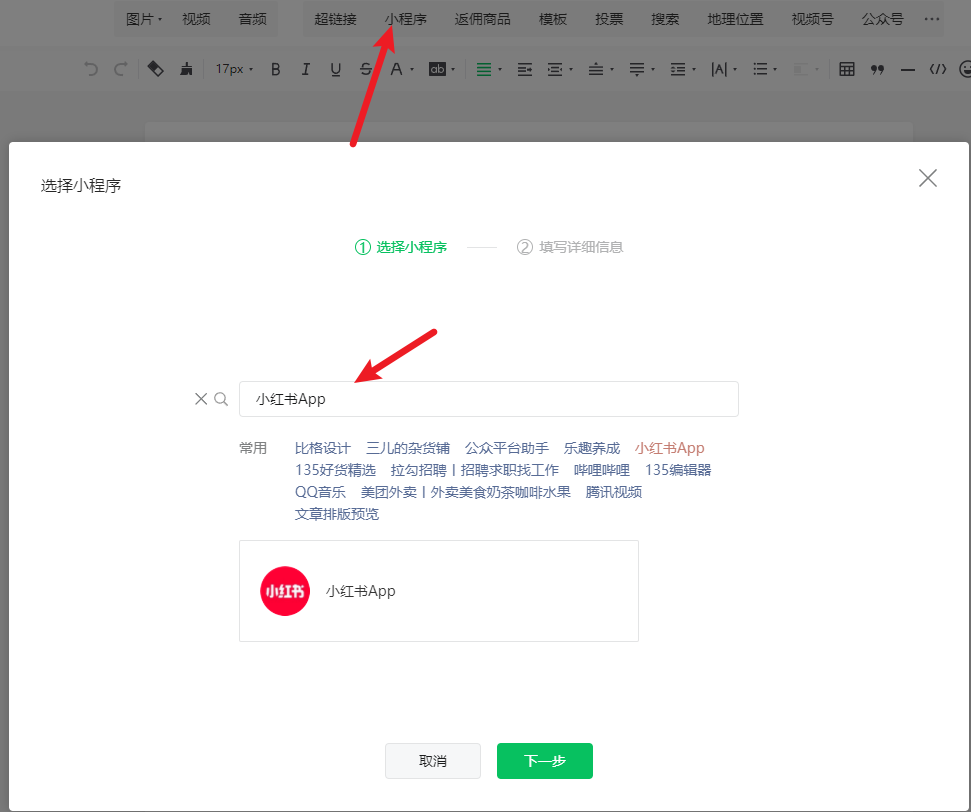 #先在微信公眾號(hào)后臺(tái),插入一篇帶有你主頁鏈接或活動(dòng)鏈接的小紅書小程序;