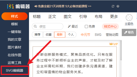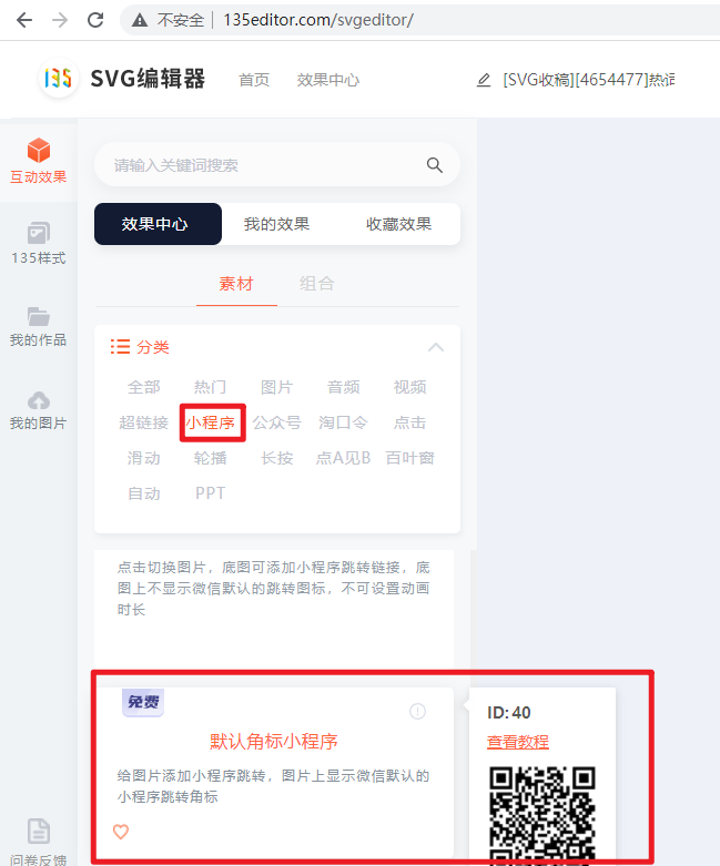 #進(jìn)入135svg編輯器,選擇小程序,根據(jù)自己的實(shí)際需求選擇對(duì)應(yīng)效果組件,這里三兒為了讓大家更直觀感受,選擇【默認(rèn)角標(biāo)小程序】組件ID:40;