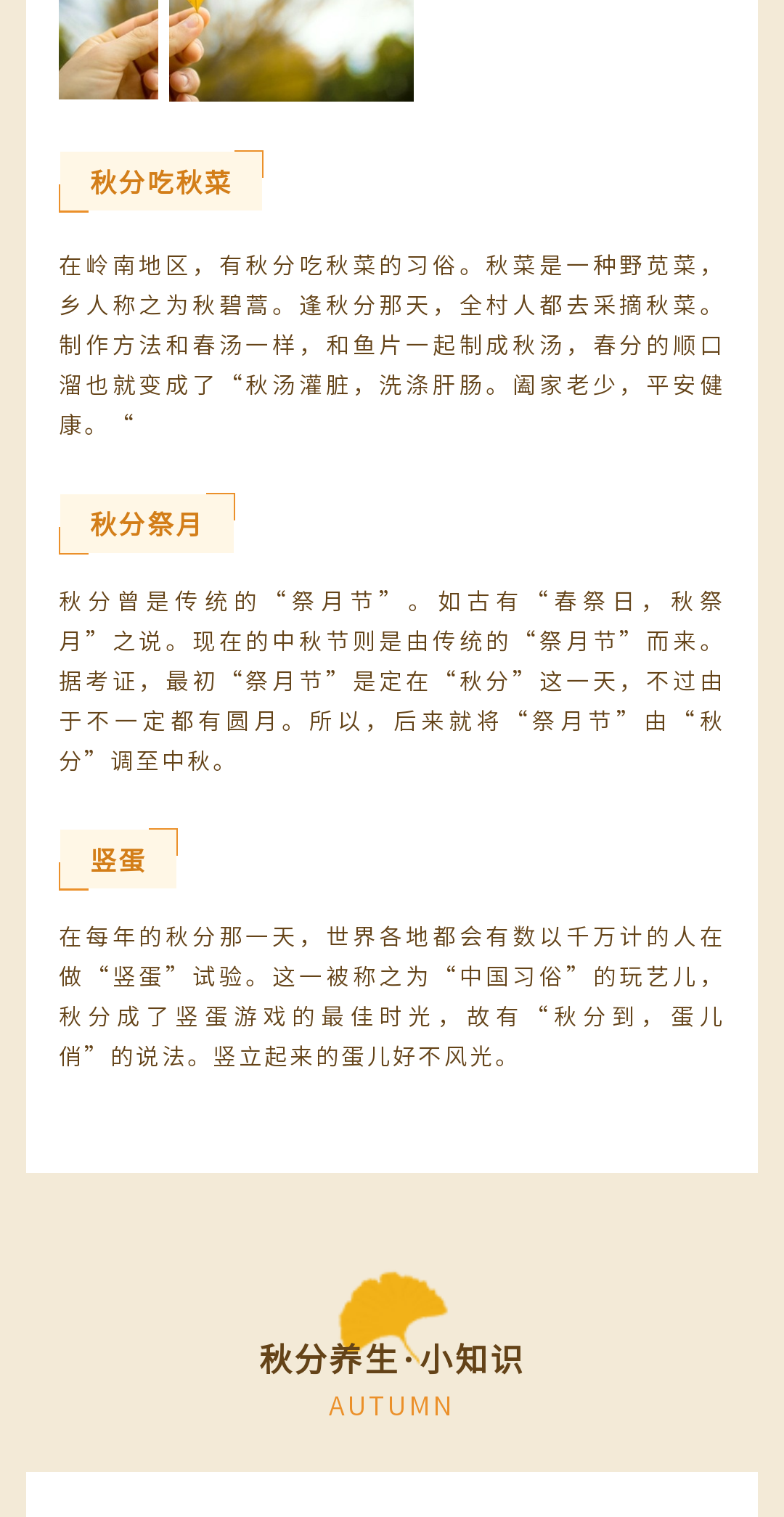 ?秋分是二十四節(jié)氣之一,可以與該節(jié)氣的習(xí)俗:秋祭月、豎蛋、吃秋菜等相結(jié)合,進(jìn)行秋分節(jié)氣知識科普。