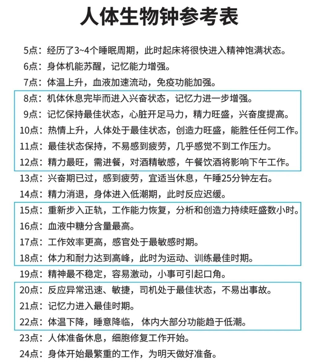 謝春霖老師根據(jù)某位醫(yī)生列出的生物鐘,簡(jiǎn)化出一張時(shí)刻表,你可以參考。