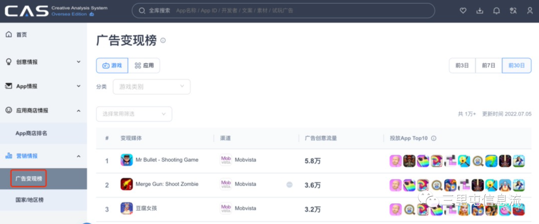 首先,通過熱云CAS海外版的【營銷情報】功能,能夠讓我們提前了解目標(biāo)市場用戶對于游戲品類的偏好。同時,借助「廣告變現(xiàn)榜」可了解IAA類游戲的產(chǎn)品類型特征及原生廣告位設(shè)計樣式,也可以幫助我們快速做好市場分析。