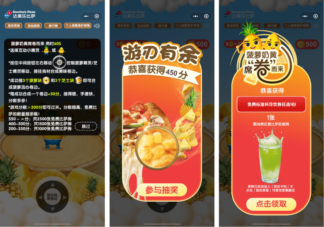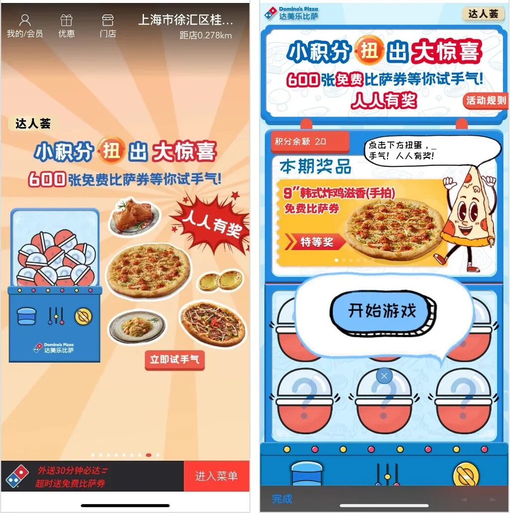 達(dá)美樂的小游戲簡單粗暴,卻絲毫不減游戲的樂趣。達(dá)美樂的訂餐 App 上,隨處可見“免費披薩的噱頭”,比如扭蛋游戲的獎項中得“ 600 張免費披薩券”。積分抽獎游戲很簡單,用戶參與的門檻就比較低,用戶參與之后都會獲得一定的獎勵,可能是免費披薩,可能是 5 折優(yōu)惠,還有可能是一些“飲料、蛋撻”等低客單價小食的免費兌換券。參與游戲的用戶,在免費獲得獎品之后,為了獲得獎品,就不得不再下一單。如果你下單,達(dá)美樂的目的就達(dá)成了。除了在 App 上不斷引導(dǎo)用戶下單之外,達(dá)美樂在公眾號的內(nèi)容更是簡單粗暴“直擊人心”,同樣用“免費披薩”的噱頭吸引用戶關(guān)注。達(dá)美樂甚至還有專門的游戲小程序,用戶在營銷推文中的小程序中參與游戲。同樣,這些游戲都很簡單,門檻也很低,最終的大獎是免費的披薩。免費披薩的數(shù)量畢竟有限,用戶更多獲得的是飲料、蛋撻等低客單價產(chǎn)品,并且這些獎品是需要消費任意披薩后才能使用。畢竟是獎品是免費獲得的,在損失厭惡心理狀態(tài)下,很多用戶就選擇再買個披薩。表面上看是簡單有趣的小游戲,實際上卻是想辦法掏空你錢包的“營銷陷阱”。4)免費的披薩