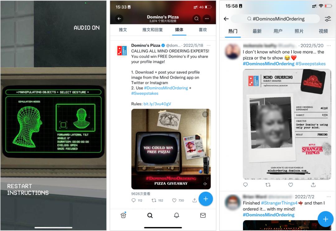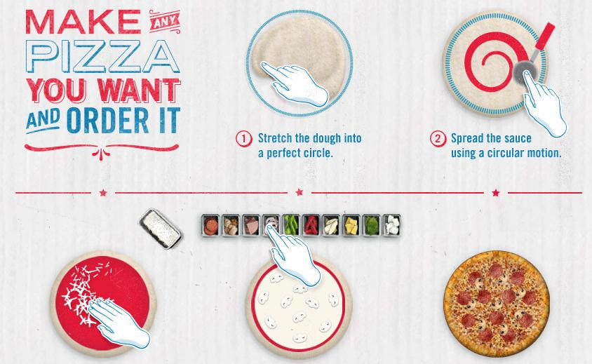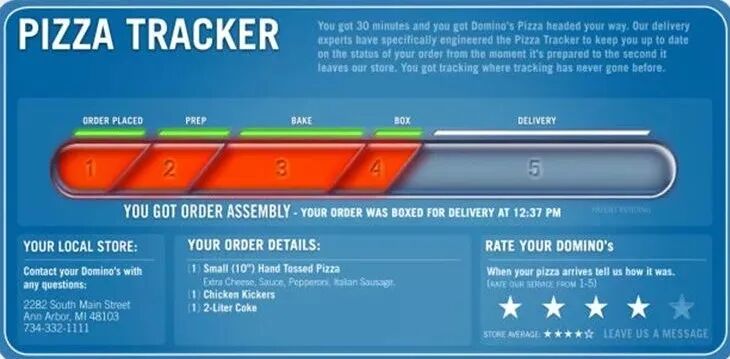 為了進(jìn)一步拉近和用戶的距離,提升信任感,達(dá)美樂曾經(jīng)上線 Pizza Hero 應(yīng)用,用戶可以用 App 來 DIY 披薩,模擬使用不同面團、醬料、芝士等原料來制作比薩,制作完成后,就可以在線直接下單,達(dá)美樂店鋪就會把用戶 DIY 的披薩制作出來。達(dá)美樂還準(zhǔn)備了 100 多種新菜式滿足不同人的口味,給用戶提供制作披薩的配方,還讓他們自己給披薩命名,分享到社交網(wǎng)站上。用戶自己動手制作披薩,再看到自己做的披薩被制作出來,會有一種很強的參與感。有意思的是,達(dá)美樂還推出了一款名叫 Tummy Translator 的 App,用戶可以在 App 選擇自己饑餓程度——“微餓、餓、很餓、餓到抓狂”,然后將手機對準(zhǔn)自己的胃“掃描”, App 會定制一張“你的胃想吃”的比薩,并可以直接下單購買,大大降低了用戶的決策成本。前段日子,達(dá)美樂還和 Netflix 上很火的影視 IP 《怪奇物語》合作,利用人臉識別技術(shù)推出用“意念”訂披薩的 App,引導(dǎo)用戶在 Twitter 帶話題上傳照片,并承諾用戶有機會獲得免費的披薩。App 的強交互性加上海報的社交傳播,讓這個活動在 Twitter 上著實火了一把,大家紛紛來體驗用“意念”訂披薩的樂趣。3)流程可視化