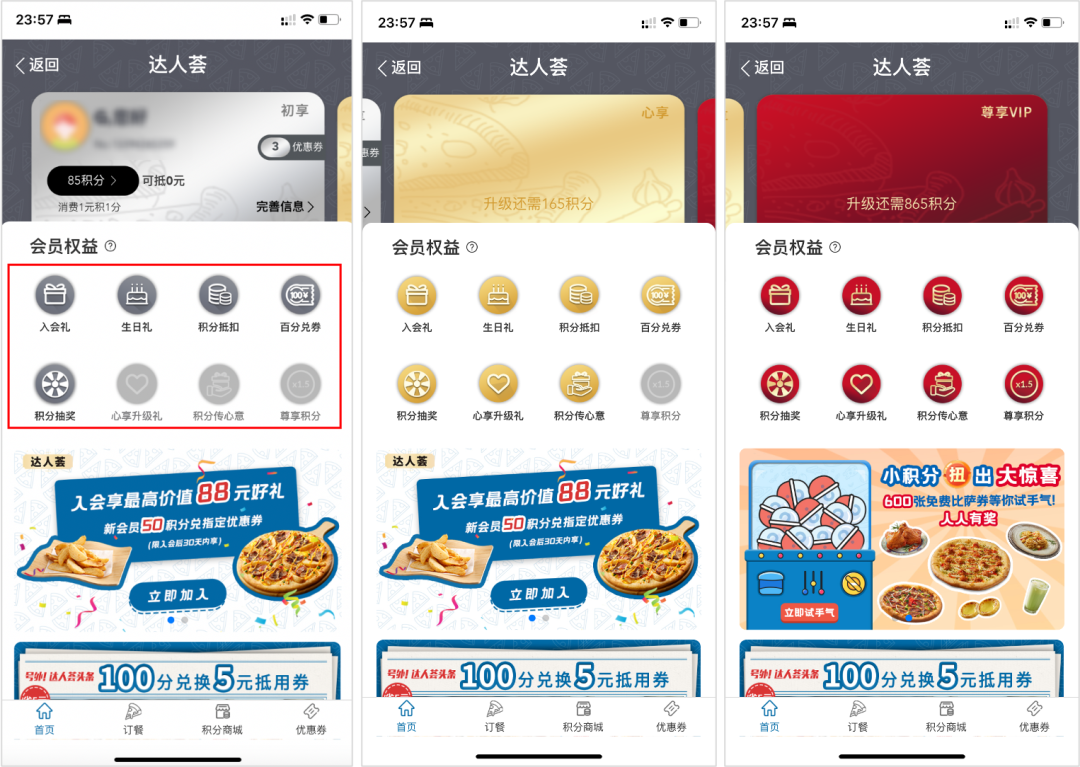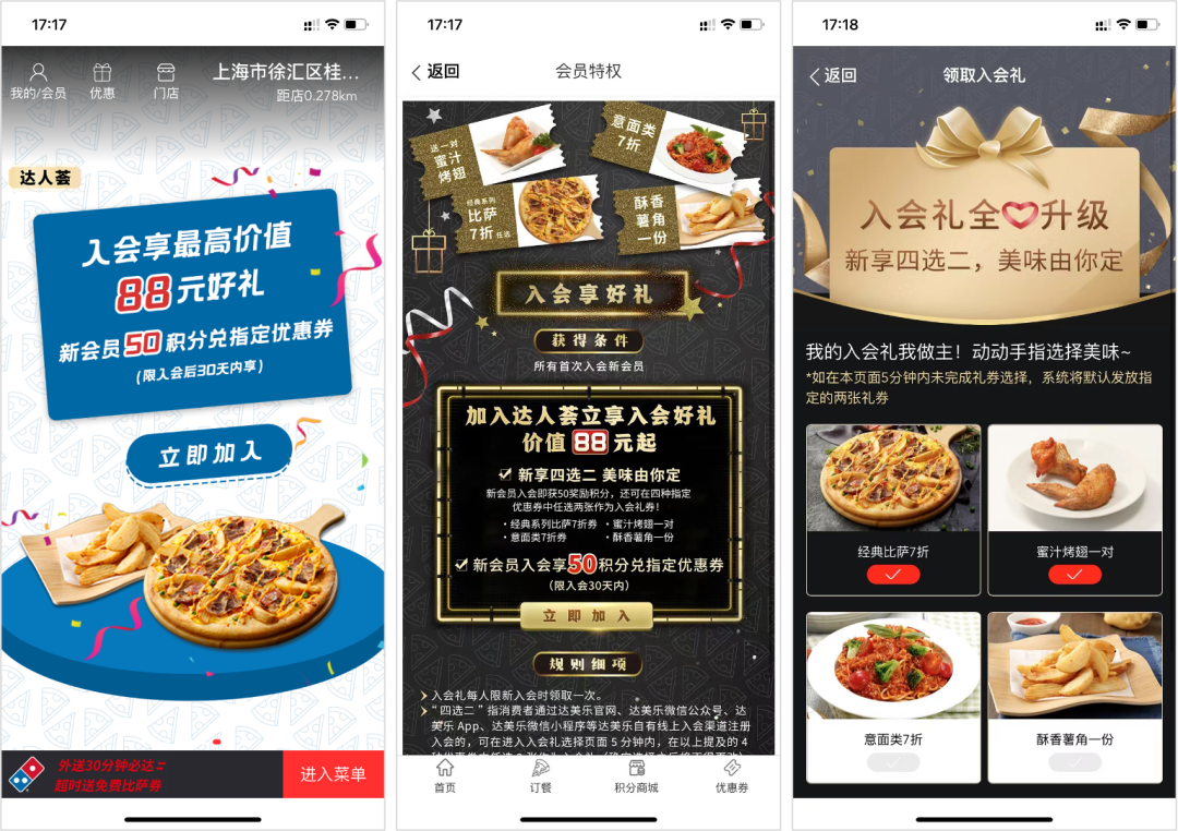 達(dá)美樂的野心,是讓訂披薩這件事完全融入在人們的生活中。達(dá)美樂對于用戶能在任何地方都能訂到披薩有一種執(zhí)念,非常重視他們的“ Anywhere ”活動,即從任何地方或任何設(shè)備上都能訂披薩的便利。在美國市場,用戶可以通過谷歌、Facebook、蘋果、Twitter 等平臺下單;在中國市場,達(dá)美樂更是把數(shù)字化玩出了花樣,將“Anywhere”踐行到底,鋪滿整個數(shù)字化渠道,線上 App、小程序、公眾號、支付寶、餓了么等全鏈路打通。全渠道會員訂餐一方面可以幫助用戶在任何地方都能訂到披薩,另一方面可以讓達(dá)美樂通過大數(shù)據(jù)的方式分析用戶的口味、偏好,在未來市場開拓中做出更有利的決策。2)會員制度強