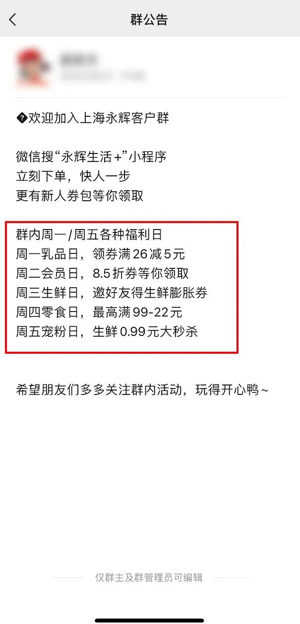 比如說,上海永輝企微社群里就將周一至周五群內(nèi)促銷活動做提前預(yù)告,培養(yǎng)用戶在社群查看優(yōu)惠福利的心智,為后續(xù)轉(zhuǎn)化做鋪墊。