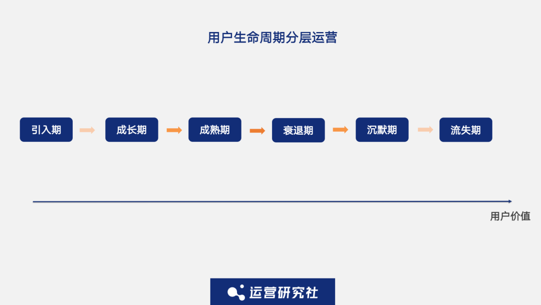 永輝在圍繞用戶生命周期,做好精細(xì)化分層運(yùn)營。據(jù)永輝線上運(yùn)營中心整合營銷負(fù)責(zé)人馮玉飛介紹,永輝將用戶生命周期共分為了 6 個階段:引入期-成長期-成熟期-衰退期-沉默期-流失期,并針對每個周期采取不同的用戶運(yùn)營策略。