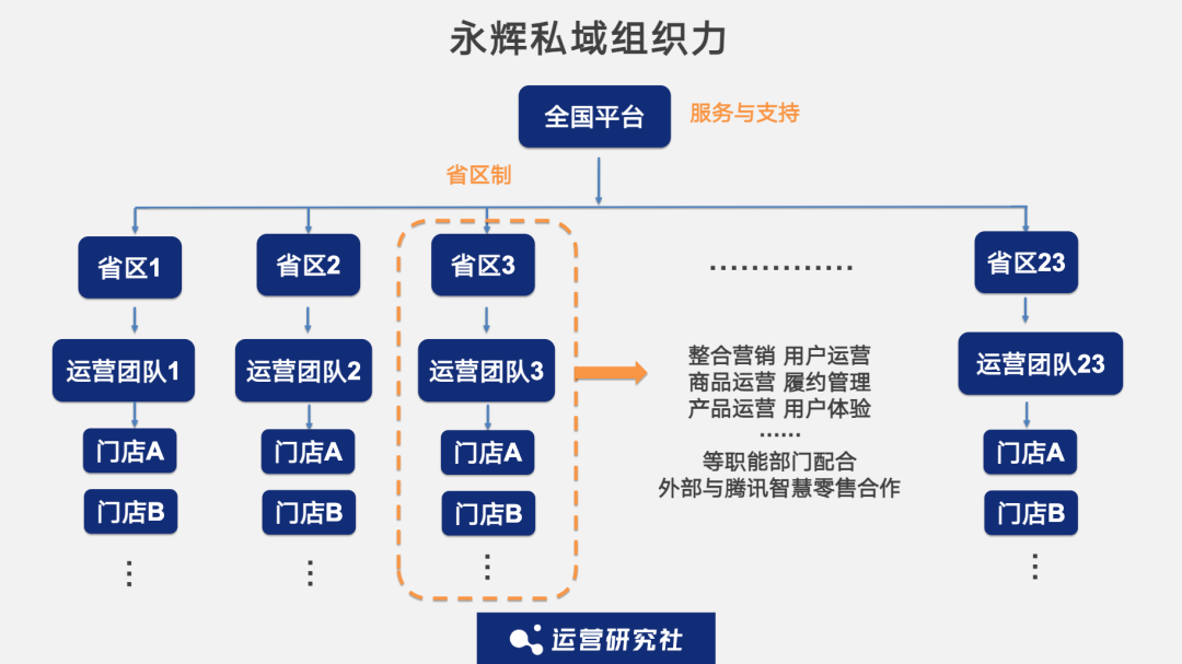 其次是各個省區(qū)的運(yùn)營團(tuán)隊(duì)。永輝在營運(yùn)前線實(shí)行省區(qū)業(yè)務(wù)制度,即每個省區(qū)都有自己的專業(yè)化運(yùn)營團(tuán)隊(duì)。省區(qū)平臺的用戶團(tuán)隊(duì)會對整個省區(qū)的用戶畫像做梳理,并對用戶生命周期進(jìn)行整體的干預(yù)和運(yùn)營動作,同時負(fù)責(zé)省區(qū)線上的業(yè)績產(chǎn)出。這種“分區(qū)自治”的模式,使得每個省區(qū)都有做好業(yè)務(wù)的內(nèi)驅(qū)力。