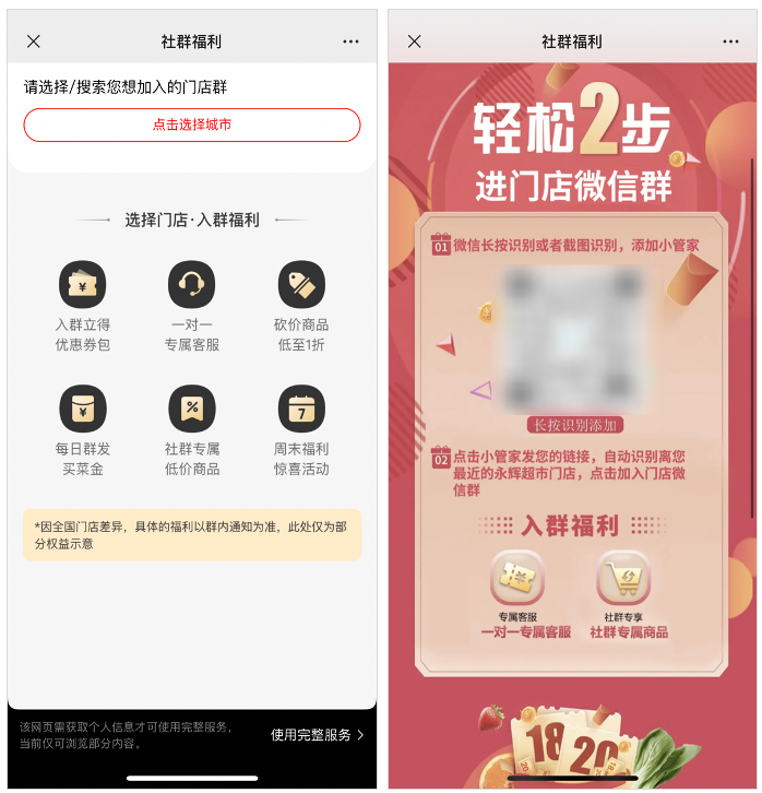 這一階段,永輝主要采用了向完成了首單消費(fèi)的用戶,發(fā)放新人券包,進(jìn)行 2-4 次的推廣,讓用戶通過形成多次購買的消費(fèi)習(xí)慣;同時永輝還會在公眾號及小程序頁面設(shè)置社群入口,放出“社群專享福利”、“砍價(jià)商品低至 1 折”等福利鉤子,吸引用戶加入附近的門店群,鼓勵和刺激用戶進(jìn)一步下單。