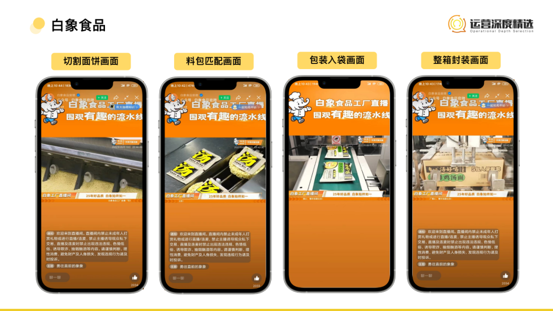 慢直播的出現(xiàn)最早集中在新聞媒體賬號,大概率你也當過雷神山、火神山醫(yī)院的“云監(jiān)工”。后來各類慢直播迅速火起來,其中也不乏商業(yè)品牌。相比主流的帶貨直播,慢直播操作更加簡單,通常是將固定鏡頭對準品牌的生產(chǎn)經(jīng)營活動,不需要專門的主播出鏡講解。而慢直播之所以能夠成立,在于相比快節(jié)奏、強目的性的帶貨,它的功利性被拋去。用戶作為云監(jiān)工,可以看到自己下單產(chǎn)品的加工過程,即使坐在工位上,也有種線下逛街的體驗感。同時慢直播帶給用戶的還也有陪伴感。不光是品牌與用戶的陪伴。評論區(qū)的實時留言互動功能,讓關(guān)注同一品牌的用戶與用戶之間也形成了陪伴關(guān)系。白象食品、瑞幸咖啡、滬上阿姨以及萬達集團都是視頻號中慢直播模式的代表,我們具體來看下:    白象食品
