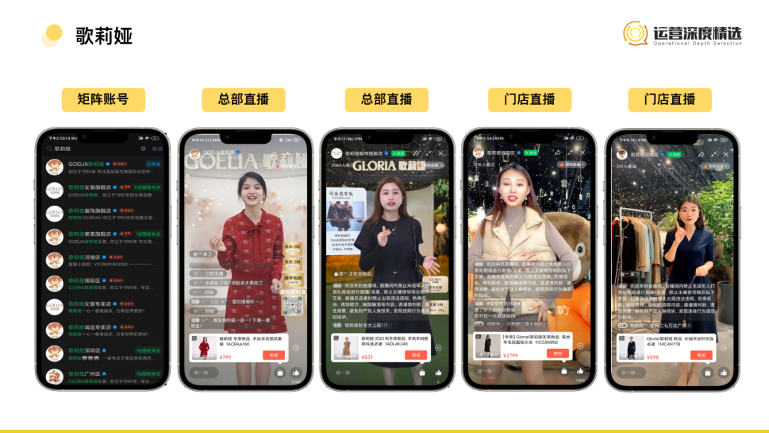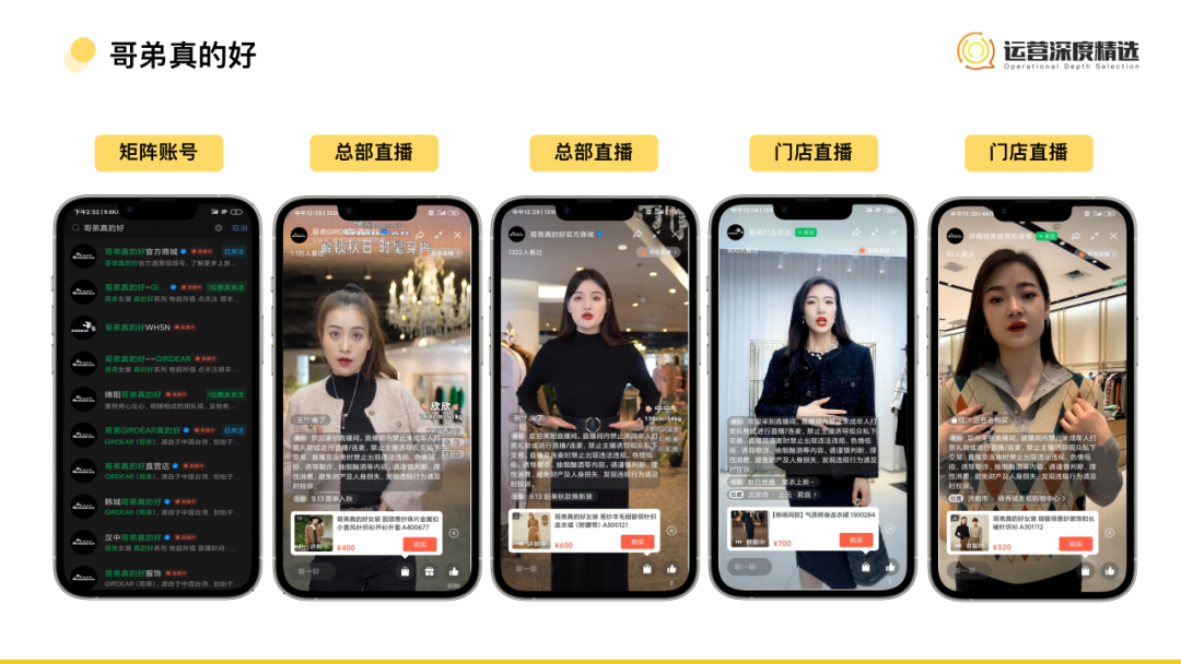 這種模式通常由總部+區(qū)域門店店長、導(dǎo)購、代理商一起組成矩陣直播,將線下龐大的銷售渠道復(fù)制到線上,形成百店同播的場景,最大程度覆蓋線上流量。這種模式下,就有我們拆過的哥弟真的好,以及歌莉婭、雅戈爾等,一起來看:    哥弟真的好