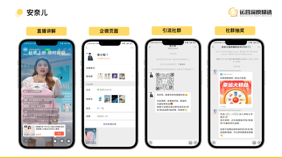 五谷磨房的私域作為標桿案例,在加上視頻號直播這個原子化內(nèi)容組件后,整體的轉(zhuǎn)化也更加順滑。直播間以專屬福利為誘餌,引導(dǎo)用戶添加到私域IP營養(yǎng)師谷莉,站在用戶視角看,享受到了商品折扣,賺到了便宜;站在品牌視角看,則將用戶留存在了自己的流量池中,增加了轉(zhuǎn)化的機會。這也是區(qū)別于其他平臺對于流量的中心化掌控,品牌對于流量擁有更多的安全感。    安奈兒