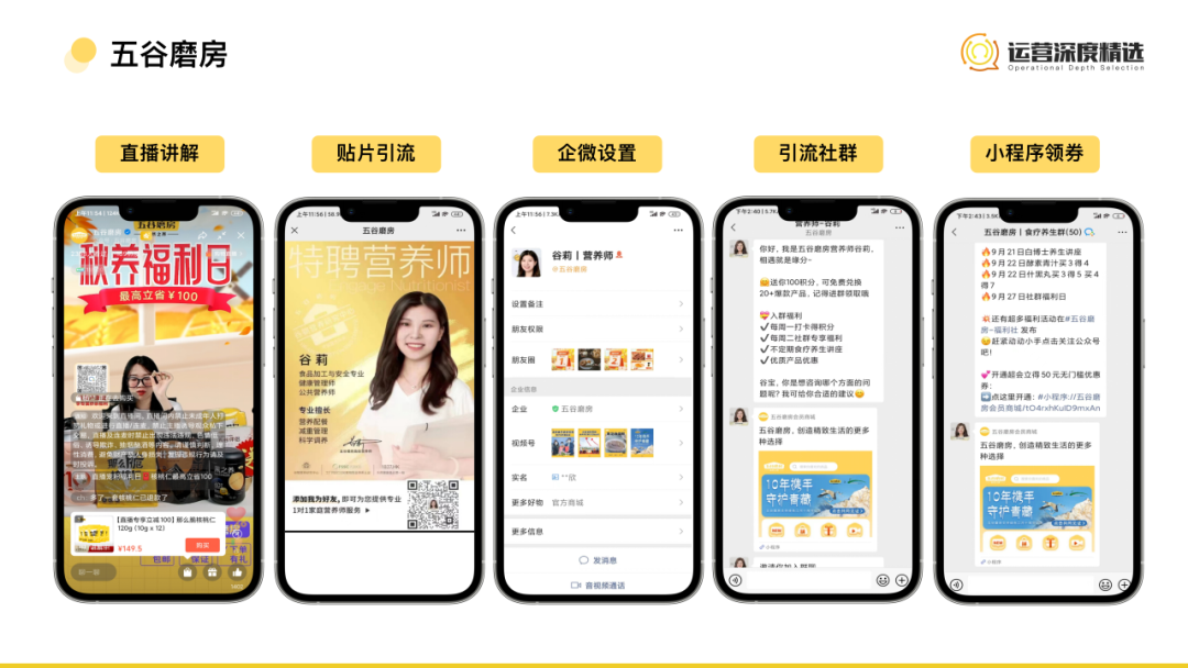 唯品會在視頻號直播的內(nèi)容與抖音直播內(nèi)容相同,屬于一魚多吃的多渠道推流分發(fā),但在每個平臺的運營上又有差異。在抖音,靠精準的投放用戶拉升銷量,帶動GMV產(chǎn)出;在視頻號,重點則在公域流量的轉(zhuǎn)為私域流量。平播的流量體量雖小,但結(jié)合頁面貼片引導(dǎo),可以很順滑地將用戶從直播間引流到企業(yè)微信、再到社群,最終又從社群回到直播間內(nèi)。用戶雖然在一場直播中沒有下單,但長期來看,在進入私域之后和品牌的距離更近,被觸達的觸點也增多,轉(zhuǎn)化也只是遲早的事。    五谷磨房