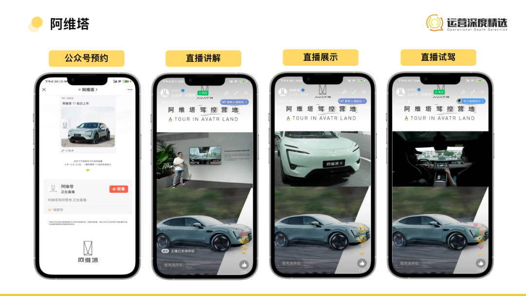 阿維塔是長安、華為、寧德時代三方聯(lián)合打造的電動品牌,這次直播針對品牌推出的首款車型進行綜合性能的試駕測評,也算是對品牌前段時間退訂風(fēng)波的一次回應(yīng)。除阿維塔之外,在視頻號直播發(fā)布會的品牌不在少數(shù),汽車品牌中還有蔚來、哪吒、小鵬等,手機品牌中有華為、小米、VIVO等。將發(fā)布會辦到視頻號中,借助微信生態(tài)不僅可以獲得更大的傳播度,基于用戶圈層的互動話題也會更多。整體來看,內(nèi)容營銷式直播在視頻號平臺也具有特殊的優(yōu)勢。這種模式下,撇去了帶貨屬性,不追求銷售額產(chǎn)出,傳播的覆蓋度和精準度成為首要指標。而視頻號作為微信生態(tài)內(nèi)原子化的內(nèi)容組件,可以被嵌入、分享到公眾號、企業(yè)微信、微信私聊、社群、朋友圈、小程序等各個觸點中,觸點背后是12.99億月活用戶的支撐,傳播覆蓋度有了基石;同時目標用戶基于社交關(guān)系鏈的分享也會帶來更加精準的潛在用戶。這一點是其他平臺無法比擬的優(yōu)勢。/ 結(jié)語
