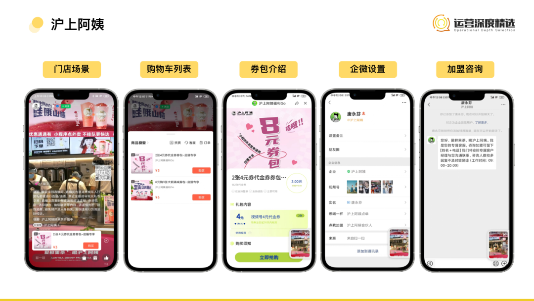 瑞幸的視頻號慢直播算得上是飲品行業(yè)的代表,至今也持續(xù)有一年多時間。直播對象是位于北京的一家瑞幸門店,直播內(nèi)容則是門店店員日常接單做咖啡的工作場景。整個過程中沒有推銷產(chǎn)品,而是在專心引流公域用戶——通過推送企微名片以及貼片二維碼,將觀看直播的用戶引流到企業(yè)微信、再通過券包誘餌將用戶引流到社群領(lǐng)券下單,最終將用戶沉淀到自己的私域流量池內(nèi)。用戶在觀看直播時會有種沉浸感,仿佛置身線下門店用,拉近了和鏡頭前咖啡師的距離,雖然沒有直接帶貨,但基于用戶過往對于瑞幸的建立的口感不錯且便宜的認知,加上沒有壓迫感的推銷,反而會主動進群領(lǐng)券下單。在直播沒有增加更多人員成本的同時,又得到了品牌曝光和流量,這波也是賺到了。如果說瑞幸的視頻號是陪伴式慢直播,那在抖音直播間里則是純商業(yè)化直播。在抖音,瑞幸采用了和常規(guī)品牌直播間大同小異的靚麗背景+帥氣主播講解,主要售賣的主要是一些店鋪的商品券,以GMV產(chǎn)出為導(dǎo)向。之所以造成這種模式的不同,從平臺層面來看,是抖音也在扶持線下團購,用戶在直播間購買后,可以直接在線下完成核銷,非常方便;而目前視頻號平臺線下核銷的功能使用率還不高,品牌商家更多是以銷售實體產(chǎn)品為主。從流量層面來看,抖音的流量基于付費投放單個費用更高,目標也鎖定在完成單次轉(zhuǎn)化上;而視頻號基于私域體系可以將流量長期留存在各個觸點中,相較于單次轉(zhuǎn)化長期觸達的價值也更高。最后再從品牌層面來看,基于不同平臺現(xiàn)階段的特性,沒有必要復(fù)制兩個完全一樣的直播間,一個做直接快速的轉(zhuǎn)化拿到GMV,一個做沉淀私域用戶的長期陪伴,也是當下兩全其美的選擇。    滬上阿姨