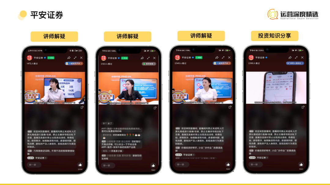 泰康保險集團在近期發(fā)起了第三季探秘網(wǎng)紅養(yǎng)老季幸福之旅系列直播,直播的內(nèi)容從預(yù)約排期上也能看出,就是帶用戶一起探秘泰康遍布全國的養(yǎng)老基地——泰康之家。相比品牌過往到處投牛皮癬般競價廣告來說,這種直播探訪形式也天然消解了一部分功利性,對用戶來說不僅不會反感,反而充滿好奇感會想要參與進來。同時在直播過程中結(jié)合福袋功能,讓用戶停留在直播間;結(jié)合預(yù)約彈窗功能,將用戶提前鎖定在一場直播中。    平安證券