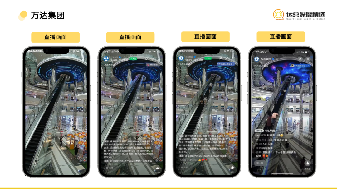萬達的慢直播從去年10月初開始,到現(xiàn)在即將有一年時間,看上去平平無奇,細品卻耐人尋味。直播的主題一以貫之,近一年時間都是“首座四代萬達廣場慢直播”。對象是深圳龍崗萬達廣場,內(nèi)容很簡單,只有一臺載著人流徐徐上升的超長手扶電梯,盡頭是充滿科幻感的宇宙天眼,再加上一段舒緩的背景音樂就是全部。但至今每場依舊能吸引上萬觀眾。而用戶的評論中也不乏“好像去現(xiàn)場感受一下”、“就像跨越了時空隧道一樣真的太漂亮了”、“這天梯有多高啊?看起來太棒了!”等留言??梢钥闯?,萬達并不是直接的營銷為目的,而是給用戶營造了一種沉浸式的體驗場景,通過直播場景的視聽設(shè)計,讓用戶無形中產(chǎn)生興趣,在傳播形象的同時還能引流線下,這波操作可以稱得上品宣邏輯下場景慢直播的代表。/ 內(nèi)容營銷模式: