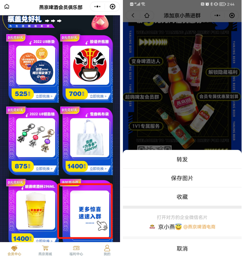 具體路徑:小程序「燕京啤酒會員俱樂部」首頁--「更多驚喜 速速入群」-掃描二維碼--添加福利官企業(yè)微信--福利官邀請入群--進(jìn)入福利群