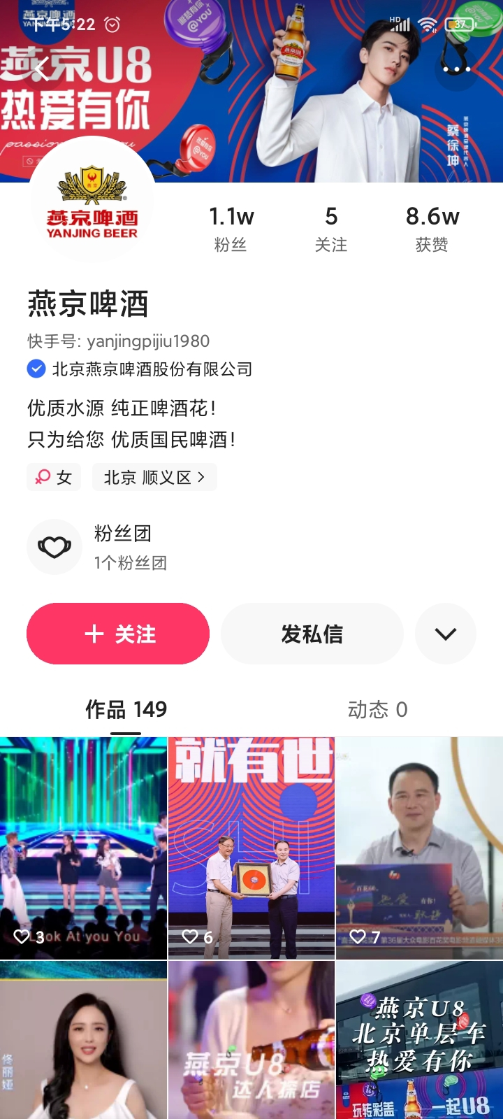 燕京啤酒在快手有1個賬號「燕京啤酒」,粉絲1.1w,主要視頻內(nèi)容是品牌宣傳、產(chǎn)品廣告以及有你劇場系列。