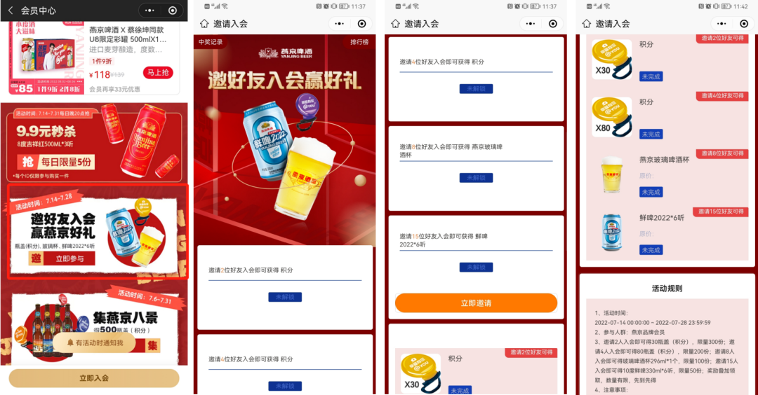 在小程序「燕京啤酒會員俱樂部」首頁內(nèi),有“邀好友入會 贏燕京好禮“,點擊后跳轉(zhuǎn)活動頁面,邀請2個好友獲得30積分,4個獲得80積分,8個獲得燕京啤酒杯,15個可獲得鮮啤6聽。