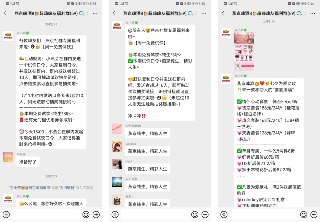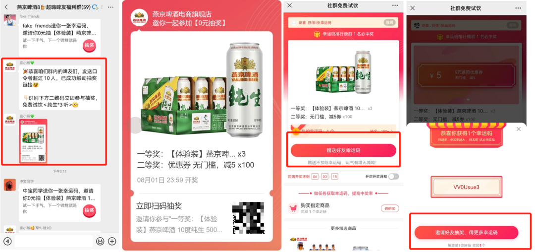 燕京啤酒會進(jìn)行一些簡單的裂變玩法,通過福利實現(xiàn)不斷拉新的效果。以社群和小程序2個渠道為例。