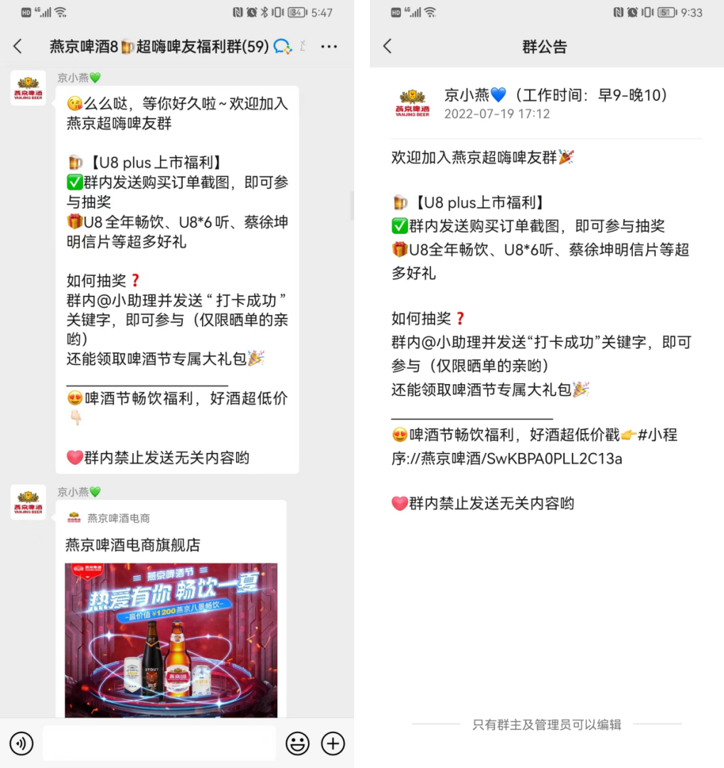 社群作為私域中促活最有效也是最常見的場景,下面對燕京啤酒的社群進(jìn)行拆解,以我添加的某個社群為例。