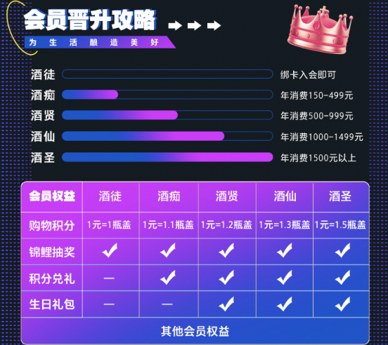 酒圣(年消費1500以上):包郵、會員價、品牌活動、購物積分1元=1.5瓶蓋、錦鯉抽獎、積分兌獎、生日禮包;