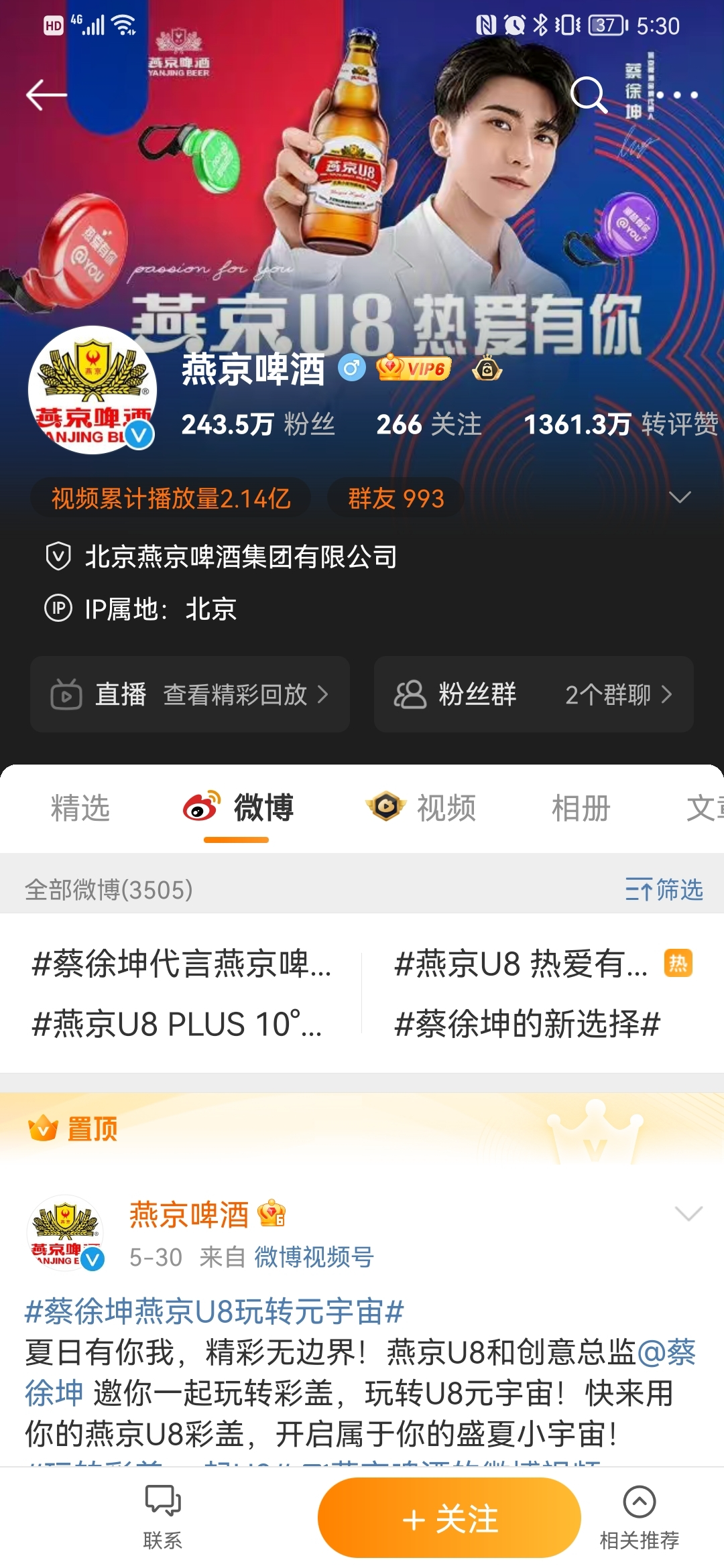 燕京啤酒在微博粉絲數(shù)243.5萬,發(fā)布數(shù)量3505條,每天都保持1-3條的發(fā)送頻率。主要內(nèi)容以品牌宣傳、話題互動、有獎互動、新品上市為主。