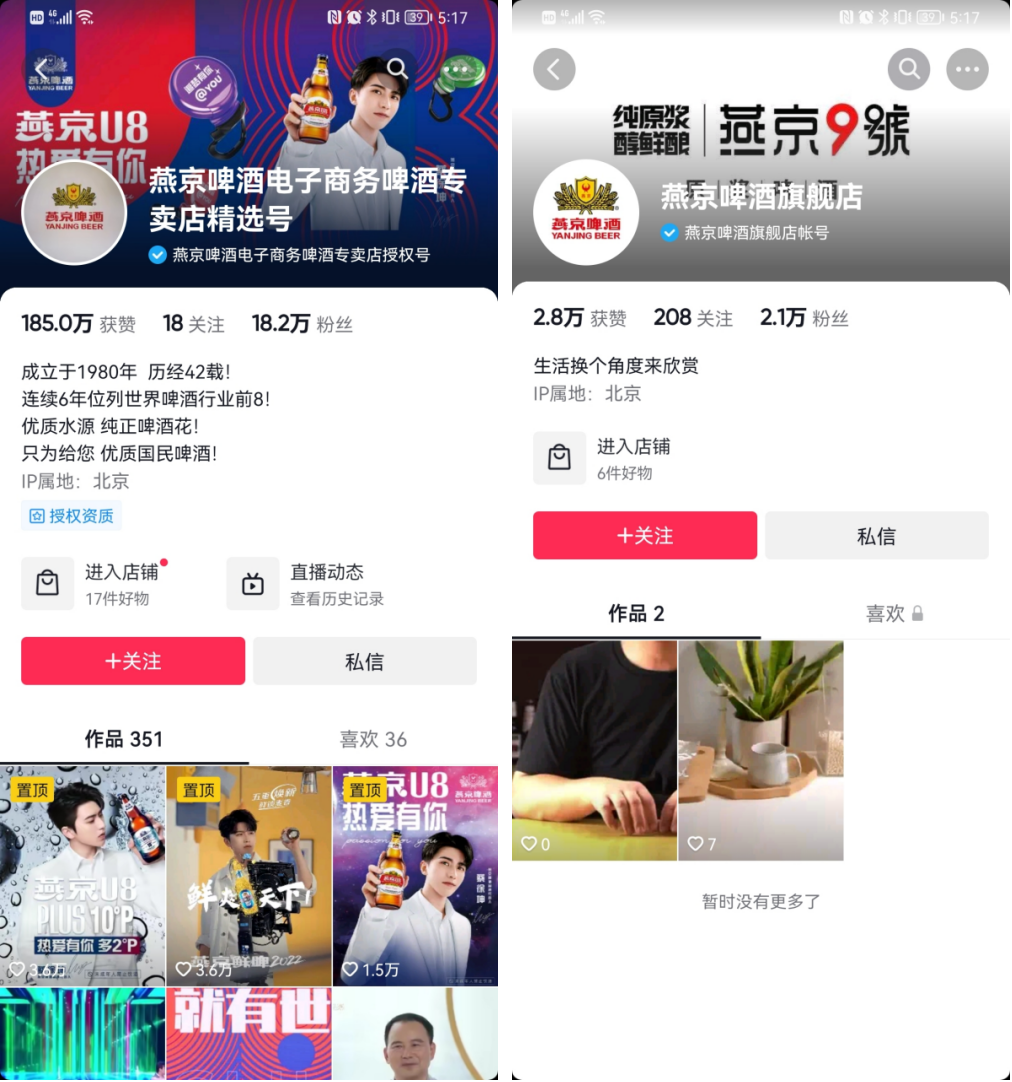 燕京啤酒在抖音有2個主賬號,粉絲共20w+,內(nèi)容都有所不同,主要視頻內(nèi)容為品牌宣傳、產(chǎn)品廣告以及有你劇場系列。