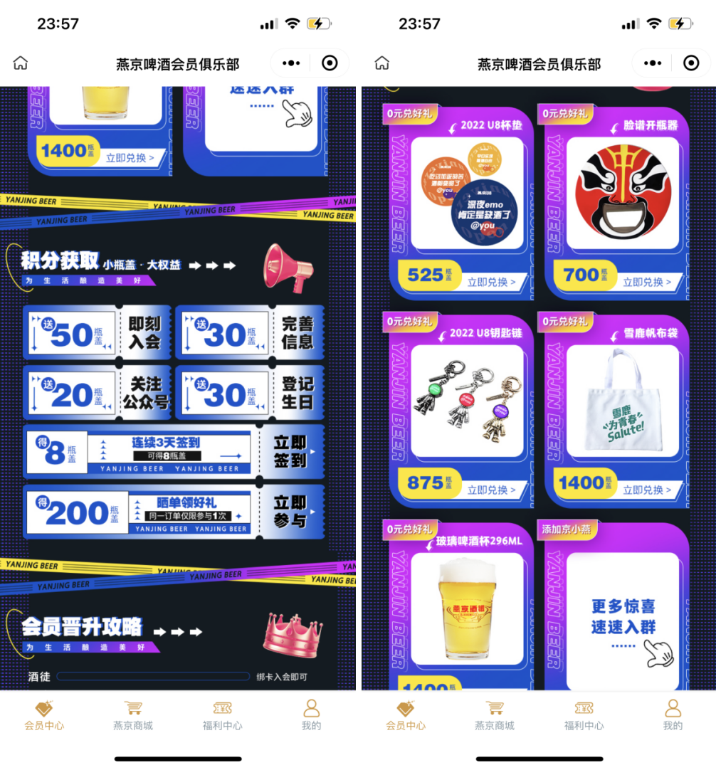 燕京啤酒會員體系主要體現(xiàn)在小程序「燕京啤酒會員俱樂部」上,具體如下: