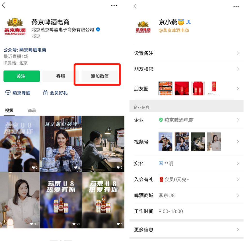 在視頻號「燕京啤酒電商」的主頁內(nèi)設(shè)置福利官「燕小京」的企微,添加后,在打招呼的海報中掃碼,即可入群。此外還有對商城和會員的引流。
