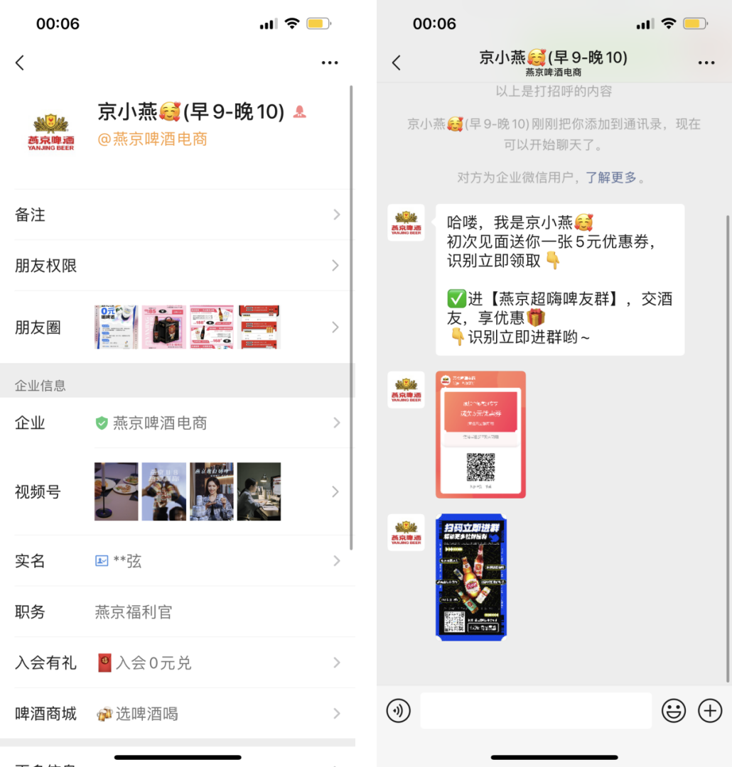 燕京啤酒對客服微信進(jìn)行了精細(xì)化的打造,建立了真實IP的形象,下面以我添加的客服為例子進(jìn)行拆解。