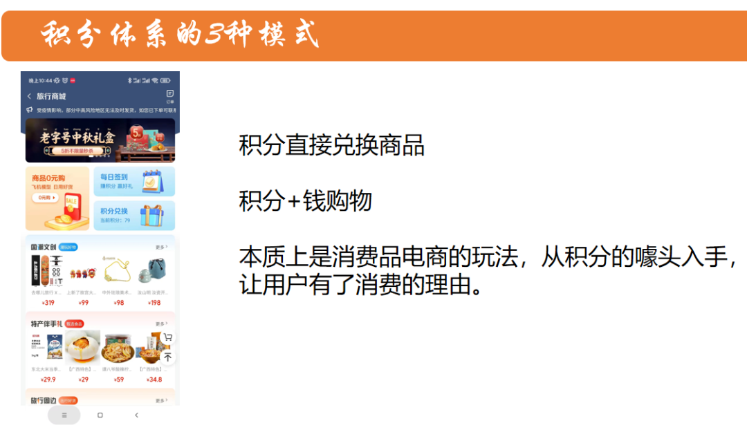 三是積分商城,用戶用積分購物,甚至用積分直接兌換商品,依靠電商的模式掙錢,但是這種模式下,產(chǎn)品的選品以及供應(yīng)鏈非常關(guān)鍵。選中的品符合目標用戶的需求且具有一定的價值優(yōu)勢。