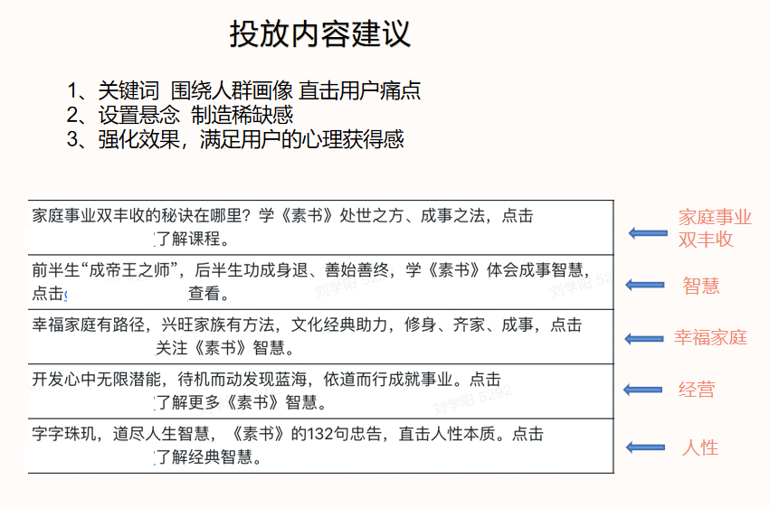 其實就是文案是影響打開以及轉(zhuǎn)化的最最最關(guān)鍵的因素,所以前期也圍繞著這個課程本身設置了許多明確關(guān)鍵詞。并且從不同的角度切入測試,看用戶對于不同角度切入的興趣度。當然,這些文案的關(guān)鍵詞也不是憑空來的,而是根據(jù)課程的直播內(nèi)容,直播內(nèi)容的熱度以及已經(jīng)轉(zhuǎn)化用戶的調(diào)研得到的,每一個關(guān)鍵詞都是根據(jù)以往的數(shù)據(jù)情況得到的。