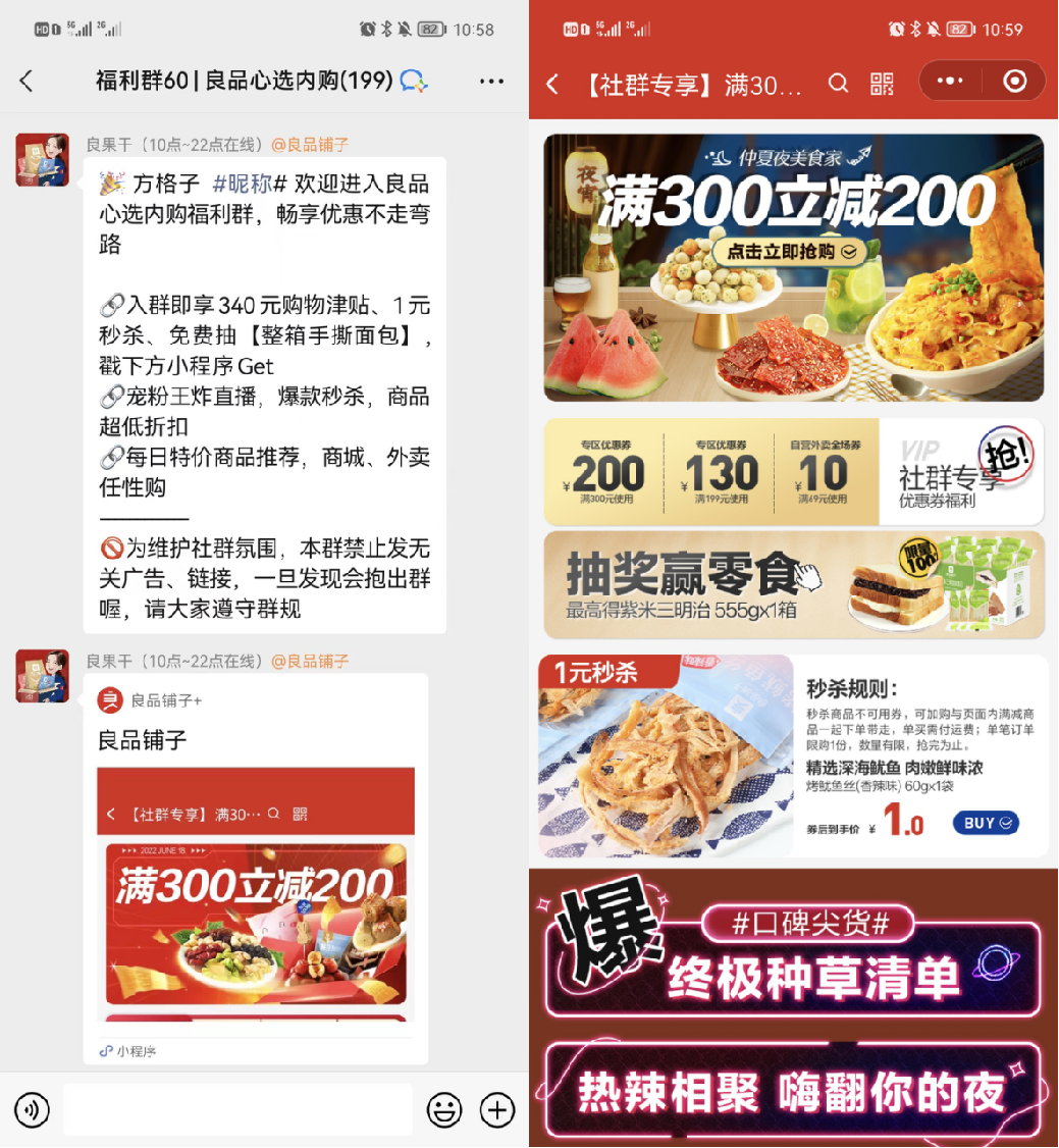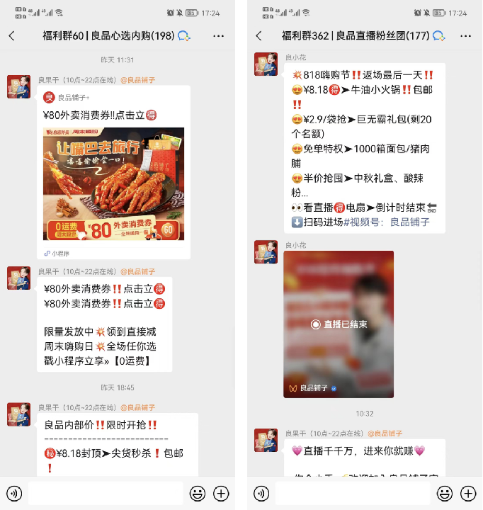 良品鋪?zhàn)拥纳缛悍譃楦@?、直播群等類型社群。不同的社群運(yùn)用不同的運(yùn)營策略,將用戶持續(xù)的留在群內(nèi)。