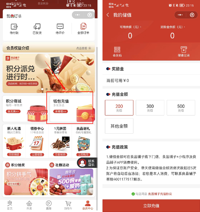 用戶可選擇200、300、500三種檔位進(jìn)行充值,充值會(huì)獲得獎(jiǎng)勵(lì)金,充得越多獎(jiǎng)勵(lì)得越多。儲(chǔ)值金額可在良品鋪?zhàn)泳€下門店、小程序等渠道使用。
