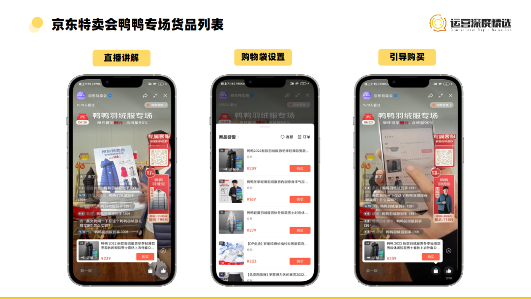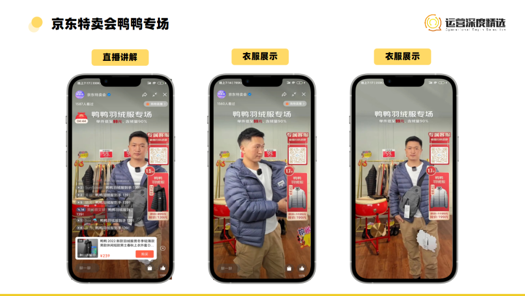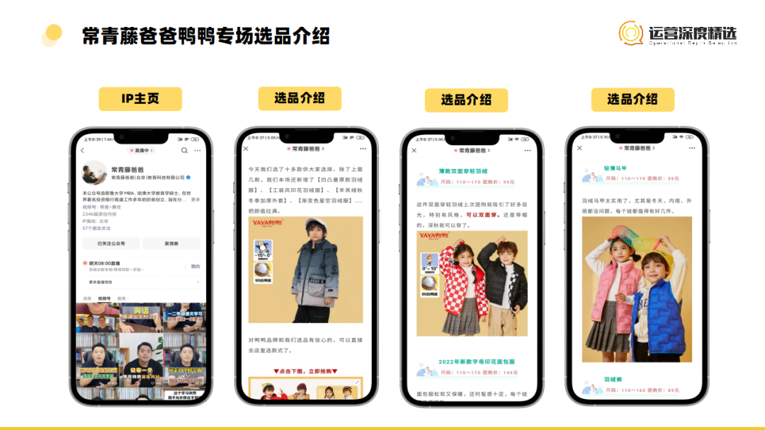 目前鴨鴨合作的供應(yīng)商有100多家,其中有10家是全行業(yè)的頭部供應(yīng)商,60%-70%的款式都是由他們生產(chǎn)。同時作為老品牌也沒落下數(shù)字化轉(zhuǎn)型升級,通過定制的BMS商品生命周期管理系統(tǒng),從原料到設(shè)計再到生產(chǎn)環(huán)節(jié)全程實現(xiàn)智能化管理,能在7—15工作日內(nèi)迅速把幾十萬訂單快速地生產(chǎn)出來。這些基本功的扎實,給鴨鴨直播提供了強有力的后盾支持。有供應(yīng)鏈作為基石,去年鴨鴨上線了2000多個SKU。如何讓不同產(chǎn)品匹配到合適渠道和人群,這是直播能夠成功的另一個關(guān)鍵因素。在過去,國貨羽絨服品牌的保暖屬性通常大于時尚屬性,所以整體消費年齡層偏大。但近幾年隨著國外品牌的影響,羽絨服的消費主力軍趨于年輕化,鴨鴨也迅速調(diào)整了品牌和產(chǎn)品定位,在品牌端將核心年齡層定在25-35歲。另外,鴨鴨的優(yōu)勢在于團隊本身就有成熟的電商運營經(jīng)驗,對于不同渠道的特點也有一定洞察:比如天貓用戶偏愛基礎(chǔ)款,抖音用戶對新奇款式更感興趣,快手、視頻號用戶對于性價比更關(guān)注,基于此來匹配每個渠道的貨盤。在此之下,不同渠道不同達人賬號、不同定位的品牌賬號要賣哪些貨品,也有細致的區(qū)分。以視頻號直播來看,在和達人的合作中,常青藤爸爸的定位是奶爸老師,日常會教授一些小學(xué)階段學(xué)習(xí)方法,粉絲群體也集中在奶爸奶媽圈層。因此所選貨品都是兒童羽絨服、羽絨馬甲,同時擁有極高的性價比,一百多甚至幾十塊錢就可以帶走。愿意在孩子學(xué)習(xí)成長教育上消費的父母,自然也不會放過這類福利直播。在和京東特賣會視頻號合作的專場直播中,更是結(jié)合賬號特賣的屬性,選品將性價比發(fā)揮到極致——吊牌價899元的羽絨服,直播間領(lǐng)券后下單只要139元,還另外贈送男士挎包一只。直播間賣爆自然也不是件難事。除了達人以及品牌合作的專場直播,在視頻號的自播矩陣中,鴨鴨的貨品選擇和主推款也各有特點,不是簡單的復(fù)制上架。和達人直播間單純強調(diào)性價比不同的是,自播的貨品會更加突出款式設(shè)計、防水防污等特點,突出品牌調(diào)性。以上都是根據(jù)賬號的定位和用戶畫像來選品。此外,數(shù)據(jù)表現(xiàn)和用戶的主動反饋也是貨品調(diào)整的重要依據(jù)。不同直播間貨品的成交情況、評論留言,鴨鴨也會主動收集向設(shè)計部門反饋需求,設(shè)計部門根據(jù)不同渠道開發(fā)不同款式和產(chǎn)品,真正做出匹配渠道用戶的產(chǎn)品。比如今年新推出的寶可夢聯(lián)名和設(shè)計師聯(lián)名,都是迎合當(dāng)下市場需求來做的改變。