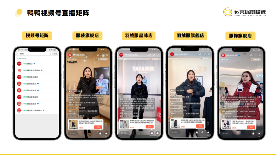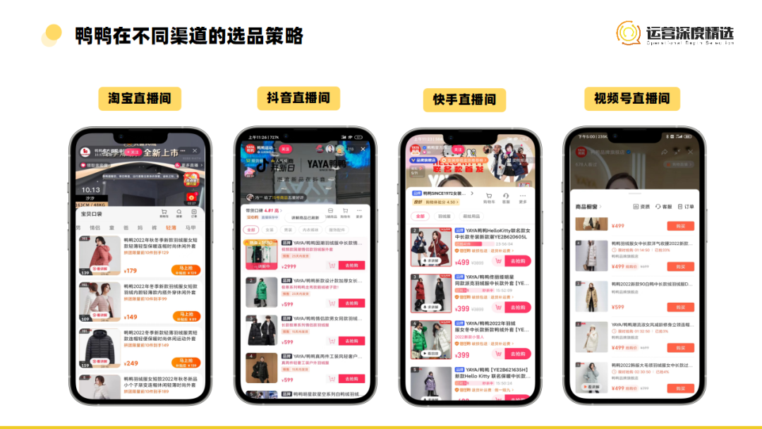 在雪山直播破圈前,這家有著50年品牌歷史的老國貨,并不常出現(xiàn)在年輕人的羽絨服品牌備選清單。有故事、有情懷、有積累的老品牌不少,但如果不能在媒介和時代變化中持續(xù)緊盯當(dāng)下的流量主陣地、翻新迭代,被遺忘是不可避免的。鴨鴨清醒地認識到了這一點。2020年經(jīng)歷品牌重組后,便開始大力發(fā)展線上渠道。從2019年GMV僅8000萬元,到2020年超35億元、2021年一度突破80億元,兩年完成了近100倍增長,今年更是把目標定在了突破百億。如此之快的翻紅速度背后,離不開鴨鴨對于線上直播流量的理解和快速占領(lǐng)。還原鴨鴨從抖音、快手到如今入局視頻號的流量策略,發(fā)現(xiàn)大致路徑都是:以達人帶貨形式鋪開覆蓋度、與明星紅人合作專場直播,打響品牌知名度,接著再以品牌自播矩陣來圈定精準的用戶人群。從2020年12月份鴨鴨開始布局抖音直播板塊,成為抖音第一波嘗試直播帶貨的商家。先后與曹穎、劉媛媛、舒暢、羅永浩等頭部達人、明星直播間合作,GMV都在千萬級別。達人本身的用戶畫像和屬性,能夠減少品牌與消費者的溝通成本,達到快速起量和提升品牌知名度的目的。在品牌自播矩陣搭建起來后,每個直播間的定位也有差異化,除旗艦店外還有男裝、運動、outlets等更加細分場景需求,對于覆蓋到不同的人群需求。到去年6月中旬,鴨鴨正式進駐快手。由于恰逢羽絨服銷售的反季,他們也先從達人端切入抓流量的策略。一開始合作的達人是以服飾垂類的為主,目前已拓展到情感類、PK類主播,從單一垂類拓展到多領(lǐng)域主播,與羋姐、真姐、蕊姐等幾乎所有快手頭部服裝主播達成合作。在為品牌帶來可觀的流量增長同時,拓寬了品牌的成交渠道。在目前快手整體業(yè)績中,達人分銷占了20%-30%,借助達人分銷,品牌在淡季也能獲得業(yè)績增長。同樣在品牌矩陣搭建起來后,每個直播間都有差異化的風(fēng)格定位,覆蓋到了的更廣人群的保暖需求。再到今年, 隨著平臺直播流量扶持的開啟,鴨鴨也開始布局視頻號直播,在今年8月份,鴨鴨和視頻號達人常爸-黃任合作了一場反季羽絨服專場直播,1萬左右的場觀人數(shù)帶來了16萬的銷售額,數(shù)據(jù)相當(dāng)亮眼。近期京東特賣會賬號也做了一場鴨鴨羽絨服專場直播,用戶互動率非常不錯,在視頻號羽絨服品類通過高性價比和國民老品牌兩大亮點,迅速占領(lǐng)用戶心智。除此之外,在視頻號直播中,自播矩陣也沒有落下。目前已開通的品牌直播間在10個左右,不同的直播間定位不同,主推貨品也各有差異,基本覆蓋了不同人群對于羽絨服品類的需求。品牌自播和達人分銷,其實是一種相輔相成的關(guān)系。除了兩者結(jié)合、快速覆蓋新渠道更寬更廣用戶人群之外,在銷售策略上也有互補。在品牌自播直播間用戶相對垂直,主播對產(chǎn)品和品牌更熟悉,專業(yè)度更高。在講解中會注重設(shè)計和款式輸出,而達人分銷則更多的是大眾爆款,著重強調(diào)性價比。/ 貨品端:渠道決定人群,人群決定貨盤