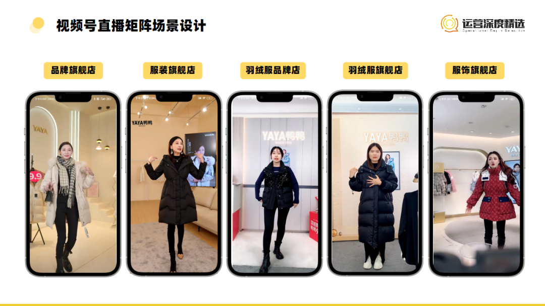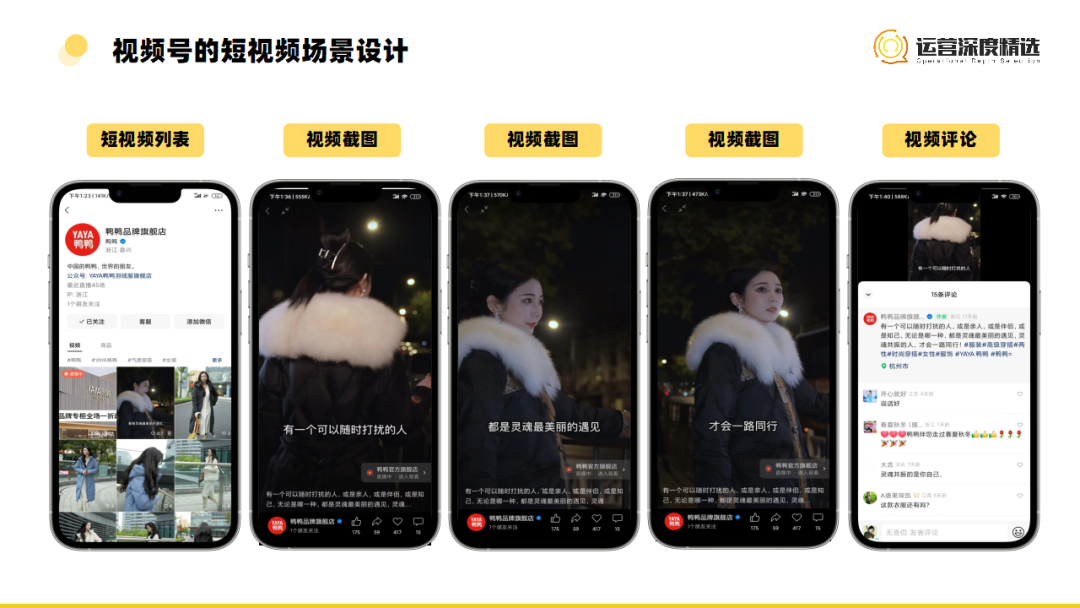 保證了流量端和貨品端的穩(wěn)定,對于普通直播間來說最難的事情都已解決。但對于羽絨服品類的直播間來說,因為貨品季節(jié)性的限制,有著明顯的淡旺季之分。如何讓產(chǎn)品沖出冬季,在淡季也能有穩(wěn)定營收不至于停播歇業(yè),就是品牌必須要解決的問題。在這個環(huán)節(jié),國貨品牌波司登選擇左轉(zhuǎn)賣起防曬服;鴨鴨選擇右轉(zhuǎn)在直播場景“卷”出一場話題營銷。在大夏天賣羽絨服本身就是一件反常識、反直覺、甚至有點離譜的事情,多數(shù)情況會被用戶認作垃圾款的清倉特賣撿漏。但鴨鴨利用了用戶的常規(guī)認知:夏天熱?那就換個辦法讓消費者身臨其境,覺得下單后有用得上的場景,打消掉他感覺買了會壓箱底穿不著的顧慮。這也就回到了文章開頭提到的雪山直播,去年8月鴨鴨把他們的抖音直播間搬上了西藏雪山,主播在直播間喊:“我們現(xiàn)在在海拔5000米,零下9攝氏度的西藏雪山上,在這里直播就是為了給大家實地展示,我們鴨鴨羽絨服的品質(zhì),到底抗不抗風(fēng),保不保暖!”今年,鴨鴨繼續(xù)玩這招,把直播間搬進滑雪場,用8天創(chuàng)造了3300萬元銷售額。通過在場景上營造反差感的這一招,鴨鴨算是抓住了淡季營銷的密碼。相比于千篇一律的室內(nèi)直播間,更加真實的戶外場景,反而吸引用戶的關(guān)注,尤其是在炎炎夏日,能夠看到雪就是一件比較新奇的事情。這也給我們了一個很重要的啟示,一定要給用戶營造一個它最熟悉或者最認可的消費場景。回到正在拓展的視頻號直播上我們來看,目前在場景上還是和普通直播間并沒有太大的差異,同樣是選擇自建場景或門店場景來進行展示。為什么在視頻號上還看不到這種眼前一亮的場景創(chuàng)新呢?一是當(dāng)下正是羽絨服銷售的旺季,雖然我們編輯部身處廣東還感受不到寒意,但北方近期的降溫已經(jīng)讓輕薄款的羽絨服派上了用場,所以暫時不需要大費周章來制造場景感;二是出圈的雪山直播是由鴨鴨經(jīng)銷商操盤,不同渠道以及不同賬號的銷售主體不同,也就沒有像之前拆解的哥弟、歌莉婭等將一場直播進行多渠道的投放。不過這套反季節(jié)場景營銷的玩法是可以持續(xù)復(fù)用的,相信在來年春夏淡季,視頻號直播矩陣中也會涌現(xiàn)出更多場景營銷的案例。目前鴨鴨在視頻號直播上要做好的還在流量端和貨品端打穩(wěn)基本盤,抓住旺季的窗口創(chuàng)造出更多GMV,在新渠道上繼續(xù)復(fù)制成功。如果說直播是與消費者面對面溝通的窗口,場景感可以促轉(zhuǎn)換;那短視頻就是讓用戶“看見”的重要宣傳通道,場景感決定了品牌的調(diào)性。與一些品牌種草視頻僅剪輯直播片段不同,鴨鴨矩陣賬號目前在短視頻中則會加入更多場景設(shè)計。比如在短視頻中搭配唯美的場景和情緒化的文案、BGM,讓服裝與特定場景匹配,贏得用戶的共鳴,從而帶動傳播和轉(zhuǎn)化。