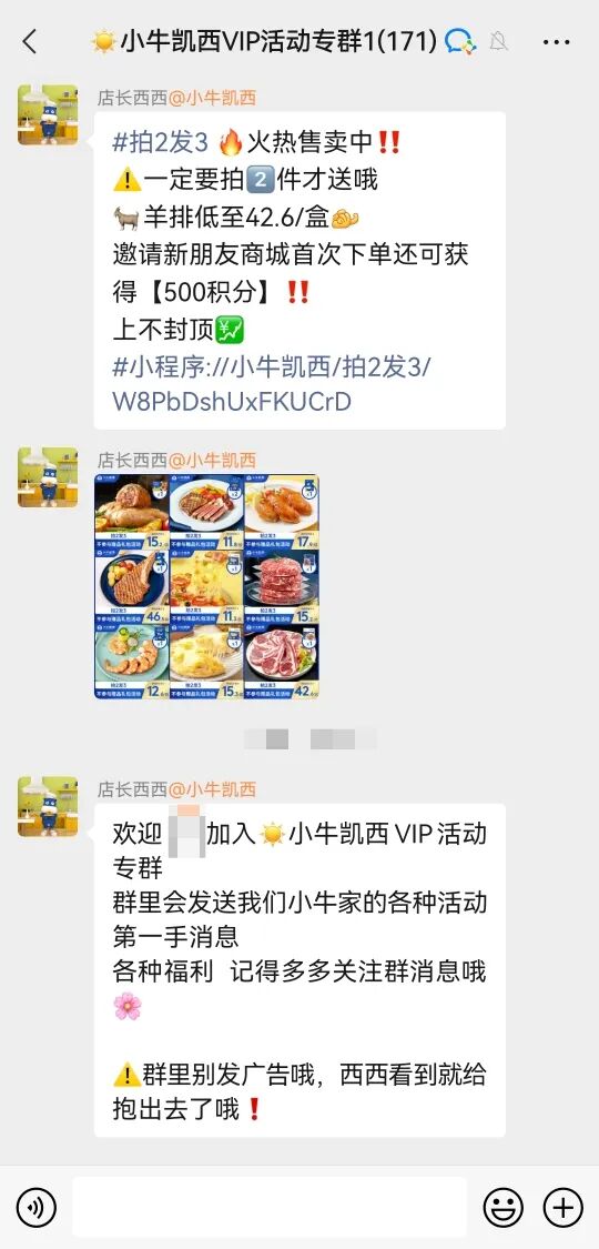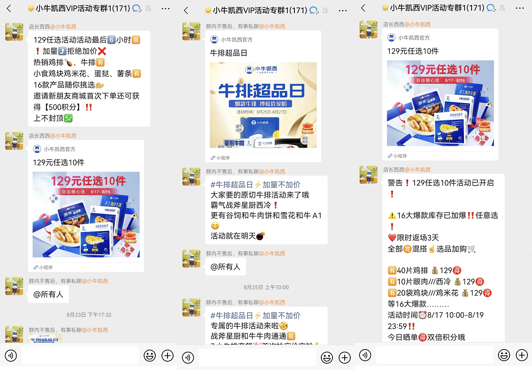 因?yàn)槭腔顒?dòng)專群,所以群內(nèi)都是各式各樣的活動(dòng),例如129任選10件、牛排超品日、拼團(tuán)等,而且僅提供售前服務(wù)。