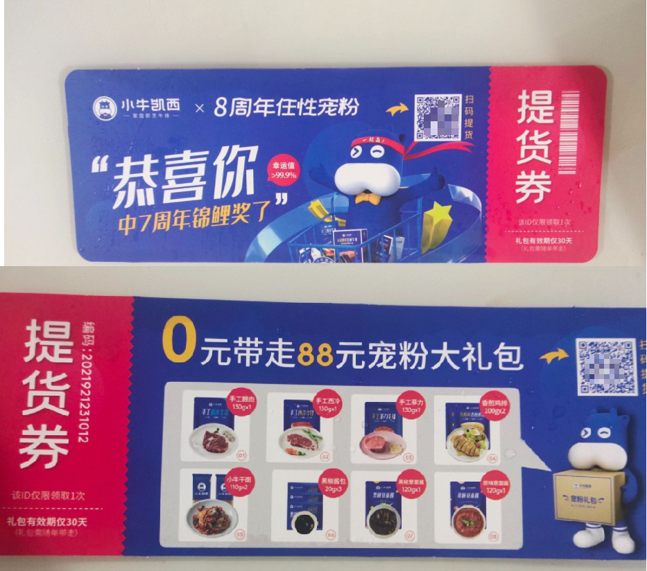 提貨券類型:以8周年慶為由做錦鯉活動(dòng),用戶購買產(chǎn)品后會(huì)收到提貨券,添加企微0元拿走88元的寵粉大禮包,不過要在30天內(nèi)消費(fèi)才可免費(fèi)拿走全部福利。