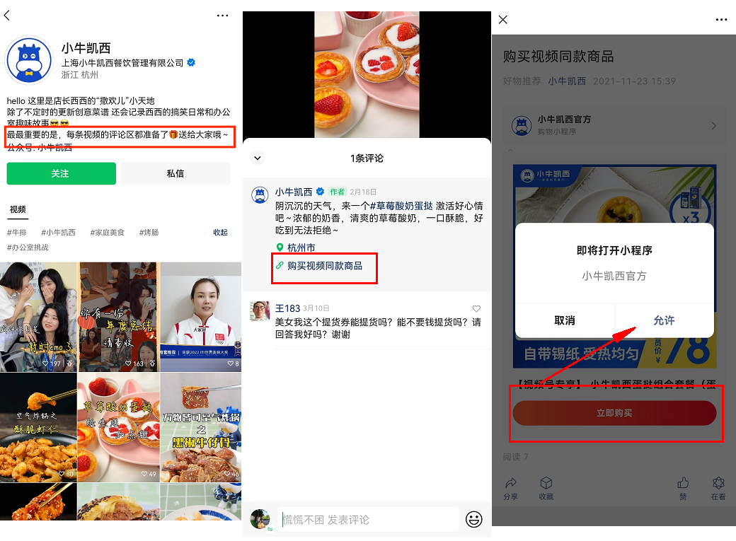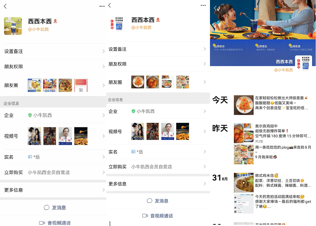 小牛凱西視頻號內(nèi)容以美食攻略、直播間片段、情景式產(chǎn)品種草以及活動(dòng)推廣為主。