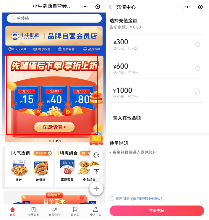 小牛凱西有300、600、1000元的充值金額,進(jìn)一步鎖住用戶消費(fèi)。用戶充值后,不僅送現(xiàn)金還送積分,積分可以兌換實(shí)物。