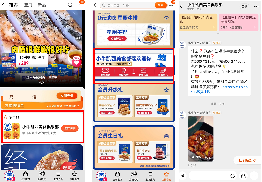 不同的是,小牛凱西建立了淘寶粉絲群,分別在首頁和會(huì)員權(quán)益中引導(dǎo)用戶進(jìn)群,聚集目標(biāo)用戶,利于更快捷地觸達(dá)。群內(nèi)容以推廣購物金、產(chǎn)品種草、店鋪活動(dòng)為主。