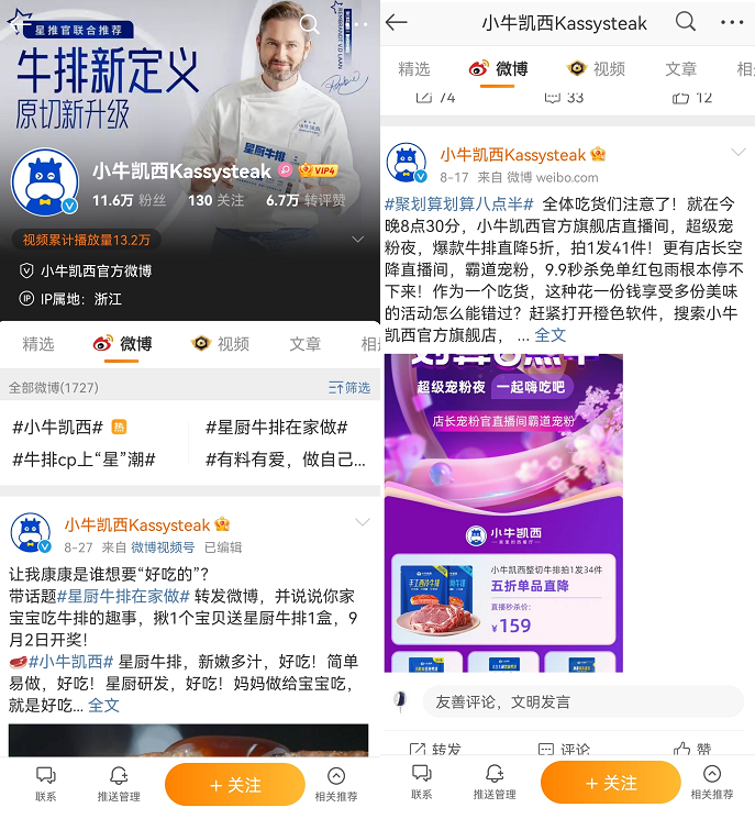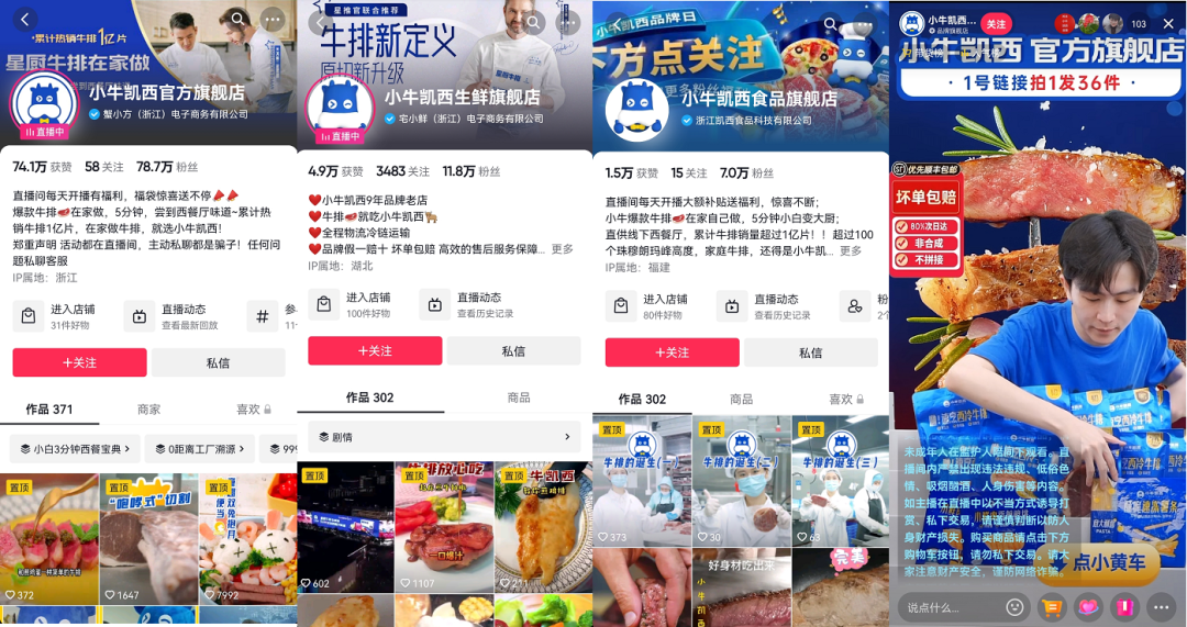 小牛凱西在抖音上,有3個(gè)主賬號,總粉絲數(shù)超過100w萬,視頻內(nèi)容以產(chǎn)品種草、美食攻略、減肥食譜等為主。另外,還會(huì)每日安排直播,主要銷售西冷牛排。