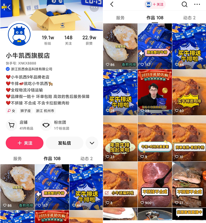 小牛凱西在快手的粉絲有19w,主要以銷售為主,視頻內(nèi)容大多為產(chǎn)品安利、牛排制作攻略等。