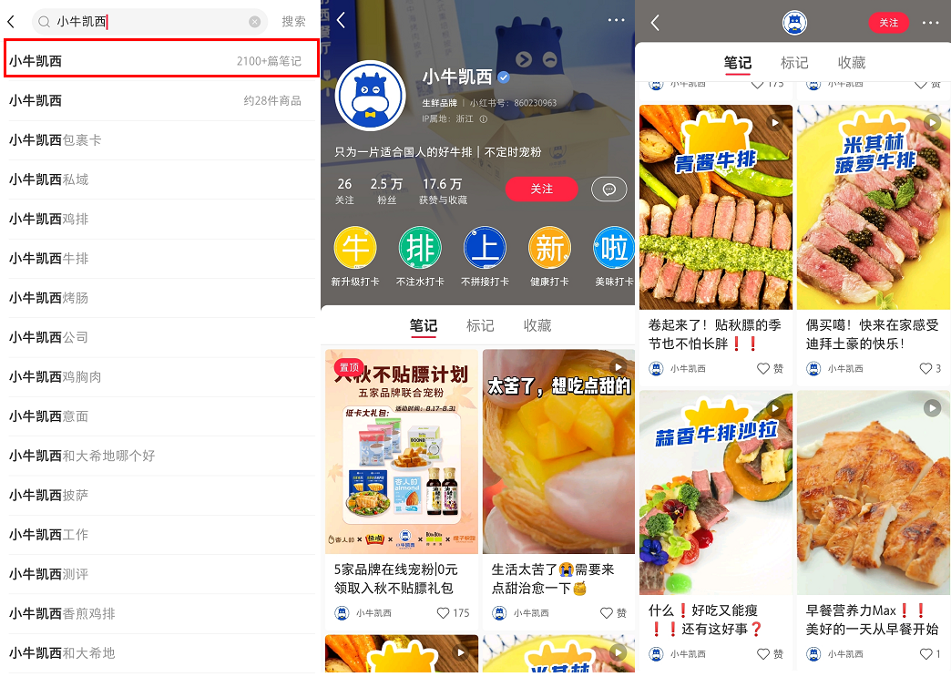 小牛凱西在小紅書中相關(guān)的筆記有2100+篇,官方賬號粉絲2.5萬,筆記以視頻形式展現(xiàn),內(nèi)容以產(chǎn)品種草、美食攻略、品牌活動(dòng)為主。