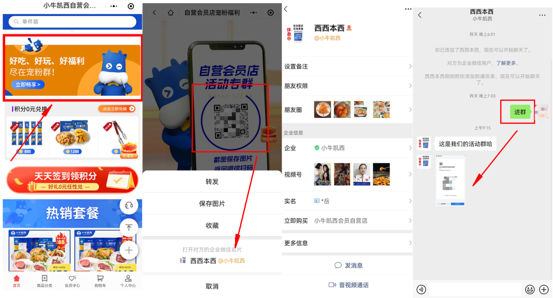 小牛凱西在小程序首頁設(shè)置寵粉群引流觸點(diǎn),點(diǎn)擊后直接跳轉(zhuǎn)二維碼頁面,識別添加福利官【西西本西】。
