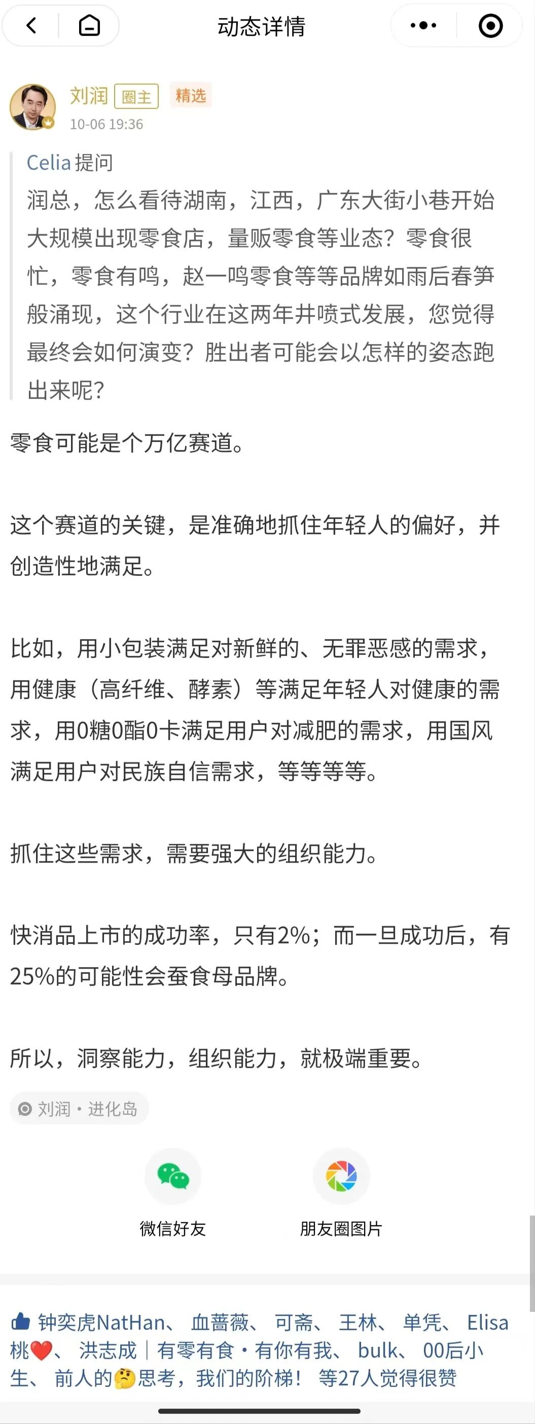 但是,把用戶私有化,只是第一步。我們還要和用戶建立聯(lián)系,要一直互動。在營銷中,有一個“7次理論”。意思是說,你重復(fù)觸達(dá)用戶7次后,他才能對你留下印象。你回想一下自己買東西的經(jīng)歷。你可能在電梯里看到一個牛奶品牌,然后在回家路上刷視頻時又看到了它。回到家里,看看綜藝節(jié)目,竟然還是這個品牌贊助的。你又想起來,原來街邊的超市和零售店,也擺放著他們的產(chǎn)品……你會發(fā)現(xiàn),你是在很多很多次觸達(dá)之后,才對這個品牌產(chǎn)生了認(rèn)知和好感,最終形成購買決策。也就是說,我們必須高頻地和用戶互動,要不斷去觸達(dá)他們。在微信的私域生態(tài)系里,有5個常見的觸點(diǎn)。公眾號,發(fā)一篇文章,可以被幾萬、幾十萬、甚至幾百萬用戶看見。但是,公眾號雖然很強(qiáng)大,可也有一個問題,就是只能單向觸達(dá)用戶,而且頻率比較低,一天一次。視頻號,雖然能一天發(fā)很多條視頻,但依然和公眾號一樣,是單向傳播的。而且公眾號視頻號想做得好,可能還需要專門的內(nèi)容團(tuán)隊(duì),成本依然很高。朋友圈,可以一天發(fā)很多條,也可以雙向互動。但朋友圈的問題,是不一定會被用戶“刷”到。所以,需要用足夠的數(shù)量去碰用戶刷朋友圈的概率。群,是出現(xiàn)在微信聊天列表里的,所以新消息會有明顯的紅點(diǎn)提醒。而且,可以和用戶雙向互動,用戶和用戶之間還能互動,容易建立很強(qiáng)的連接。但是,群的問題是,管理成本很高。群里每天有大量的消息,稍微不看,就堆積了幾百條,容易遺漏,甚至引起投訴。想要群運(yùn)營良好,就必須大量投入人力資源。私信,應(yīng)該是和用戶互動效果最好的。一對一的場景,強(qiáng)提醒,能互動,不限次數(shù)。但是,也因?yàn)槿绱?,很容易對用戶形成打擾,破壞用戶的體驗(yàn)。你發(fā)現(xiàn)了嗎,每個觸點(diǎn),雖然都有自己的優(yōu)勢,可也有明顯的局限。小餅和我說,我們也在想,那能不能有第6個觸點(diǎn)呢?這個觸點(diǎn),能一天多次觸達(dá)用戶,還能和用戶雙向互動,用戶和用戶之間也能互動,并且還不會產(chǎn)生打擾?所以,我們就嘗試開發(fā)了一個微信小程序:鵝圈子。鵝圈子,就相當(dāng)于一個社群。大家可以在這個社群里,發(fā)表自己的觀點(diǎn)和見解,產(chǎn)生高頻地互動。這個觀點(diǎn),很有洞見。于是,我也在鵝圈子上,建了一個自己的私域圈子:劉潤·進(jìn)化島。比如,我可以發(fā)帖。就像發(fā)朋友圈一樣。有什么樣的想法,都可以分享。也能和島民們互動。我之前寫了一段關(guān)于要素品牌的思考。沒過多久,就有島民給我評論。Intel,就是這么做的。原來FABE,也是這么做的。再比如,還可以問答。有什么問題,都可以向我,或者向島上的嘉賓提問。一位叫Celia的島民就問了我一個問題:怎么看零食這個行業(yè)?勝出者可能會以怎樣的姿態(tài)跑出來呢?我也分享了一些我的看法。零食是個萬億的賽道。而這個賽道的關(guān)鍵,是準(zhǔn)確抓住年輕人的偏好,并創(chuàng)造性地滿足。想要抓住這些需求,就需要強(qiáng)大的組織能力。所以,洞察能力,組織能力,極端重要。